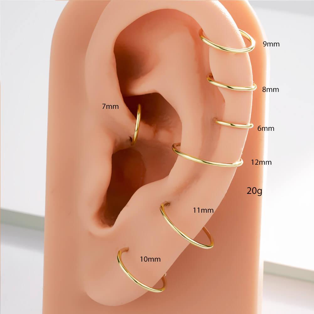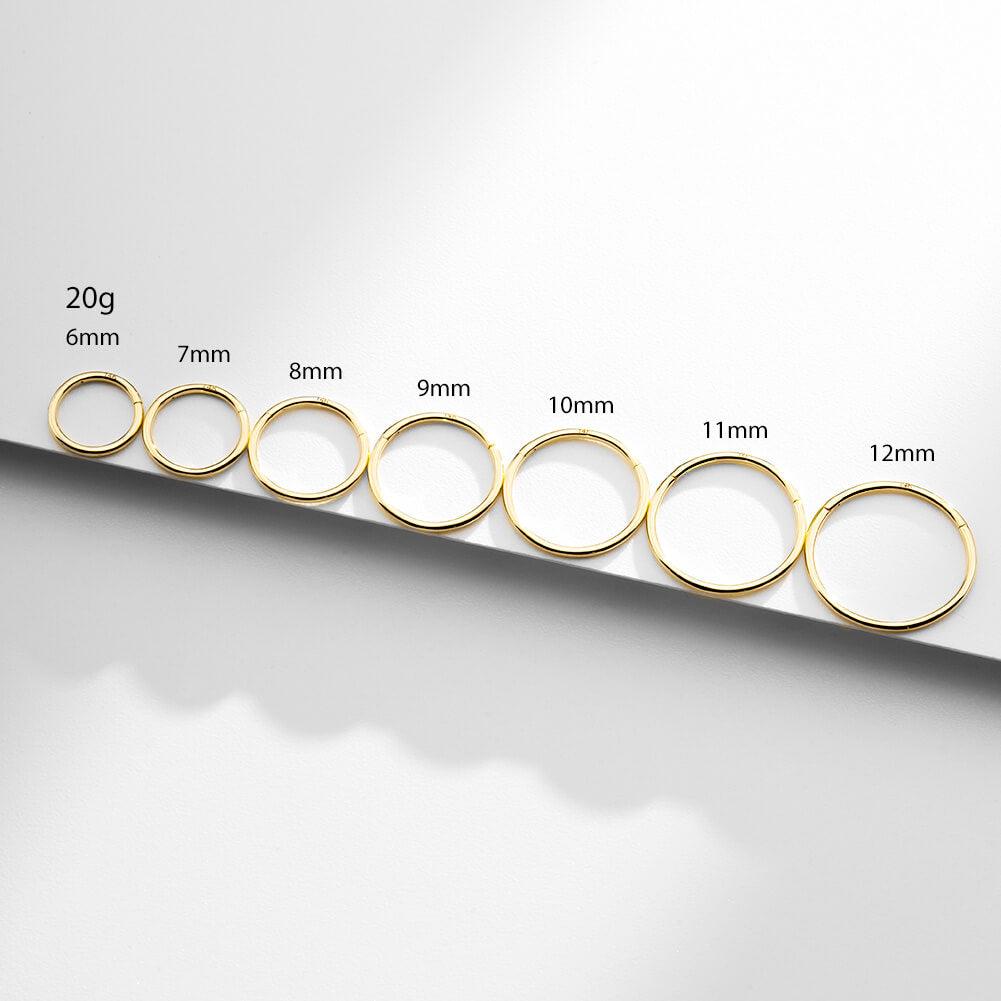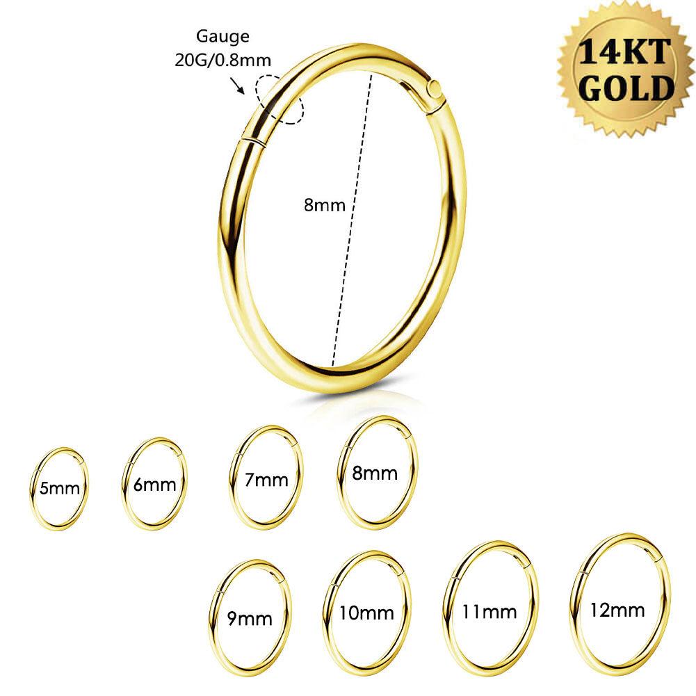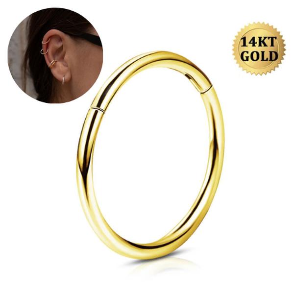 Made of 14K gold Hinged segment hoop. The bar thickness is 20G(0.8mm), inner diameter is 6mm, 7mm, 8mm, 9mm, 10mm. It can be worn on most cartilage piercing, daith, helix, conch, snug, tragus, lobe, rook, and nostrils.