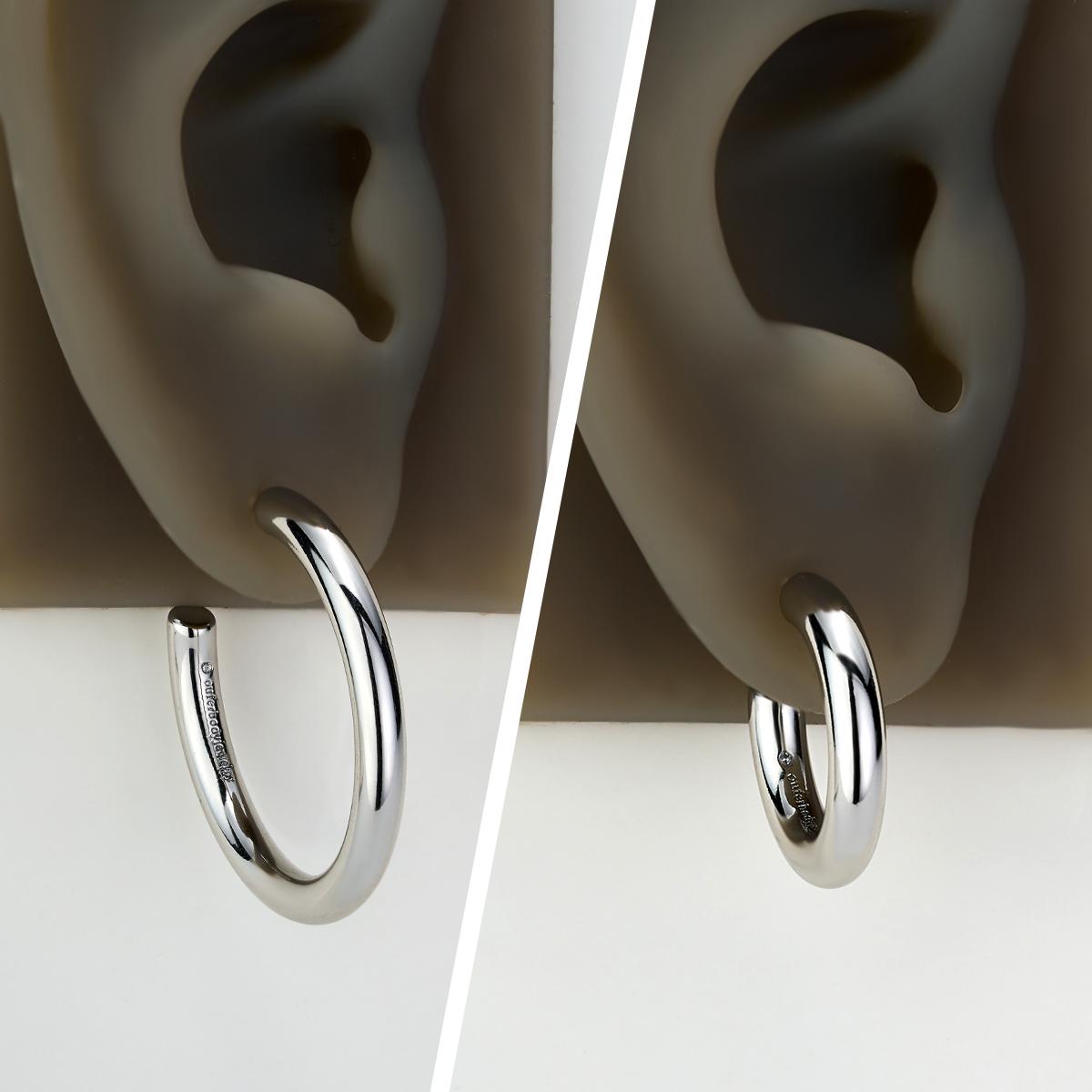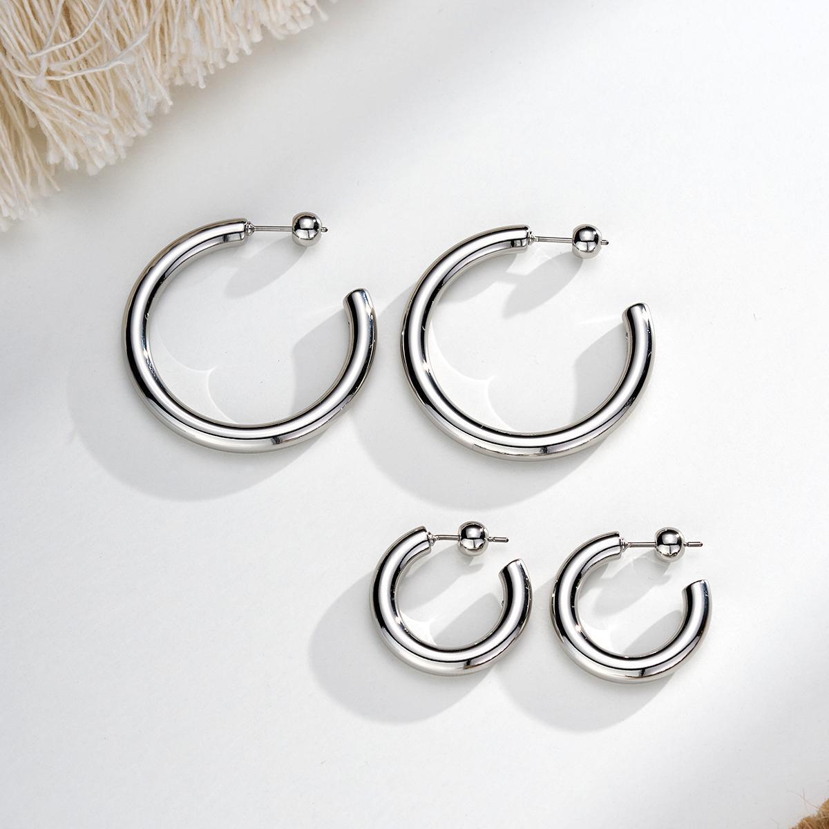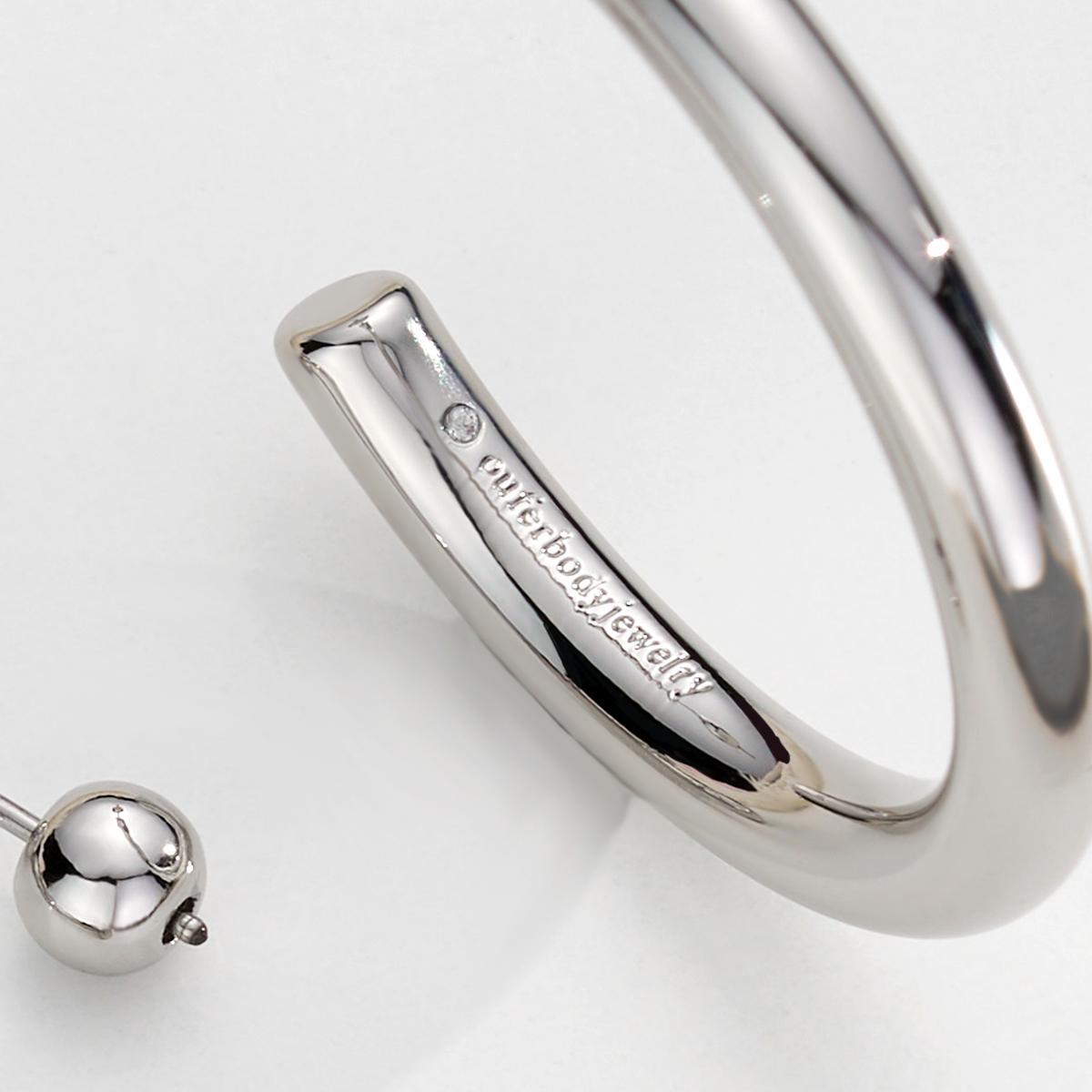 The hoop earring features a unique logo carving design and comes in both silver and gold outer diameter options of 36mm and 23mm. Its water-safe construction ensures durability for long-lasting use.