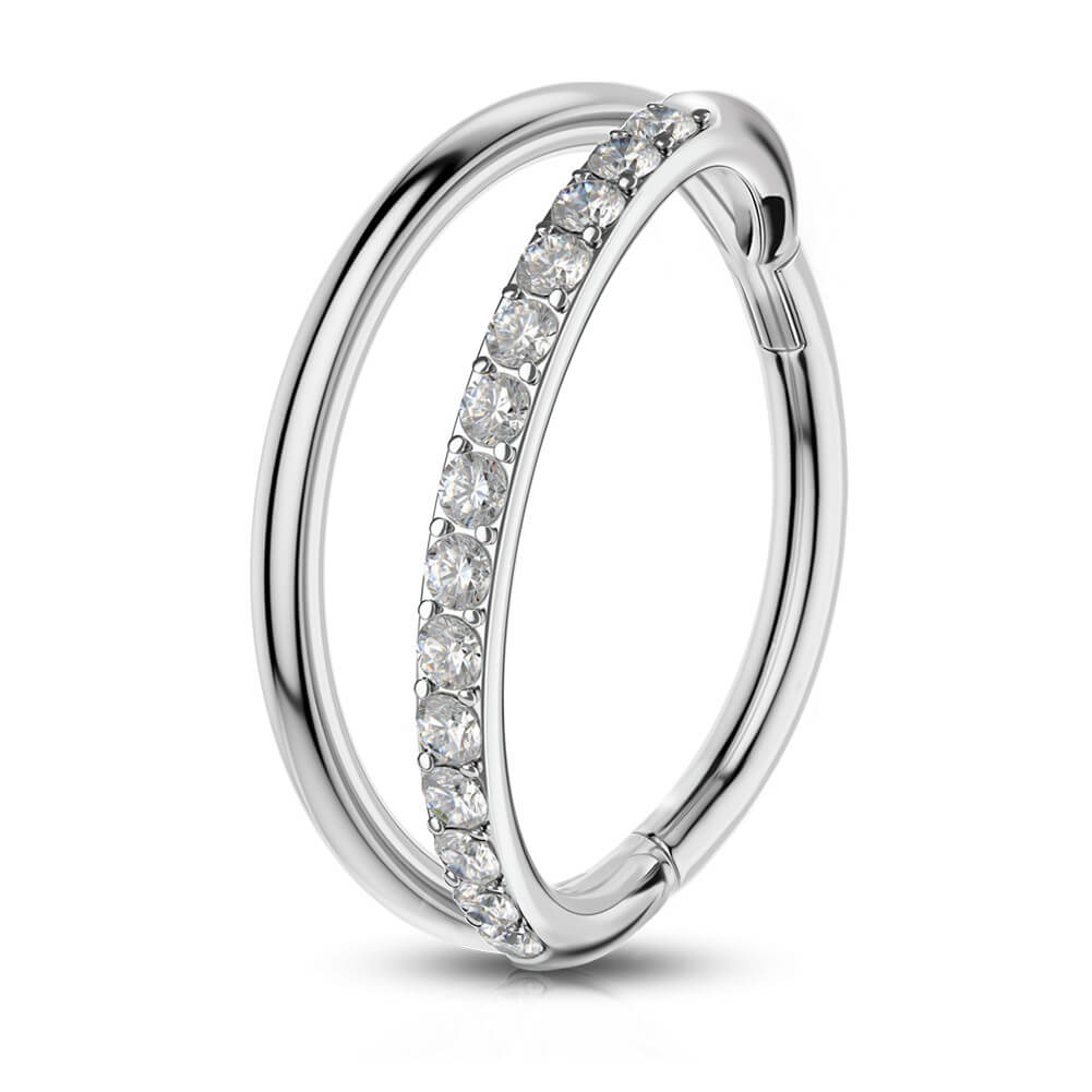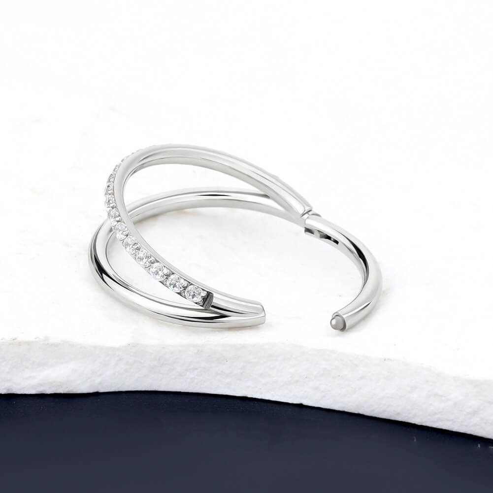 This hinged segment unique conch piercing jewelry features two hoops, one is pure stainless steel, and the other one is mosaiced with shiny CZ gems, daily and also design sense. Three different diameters, able to wear anywhere on your ears.