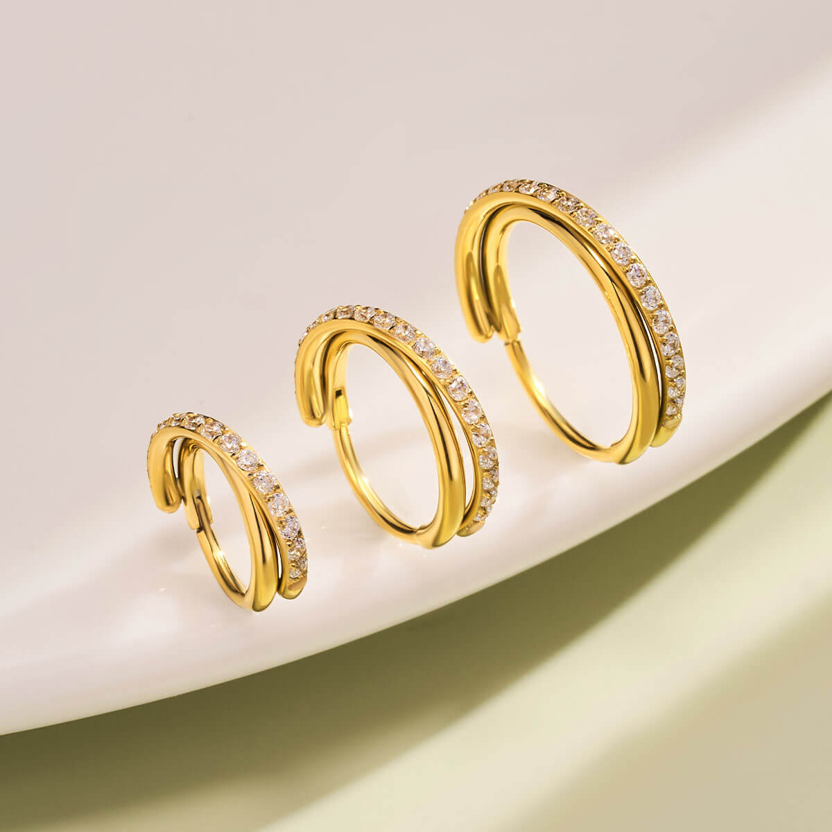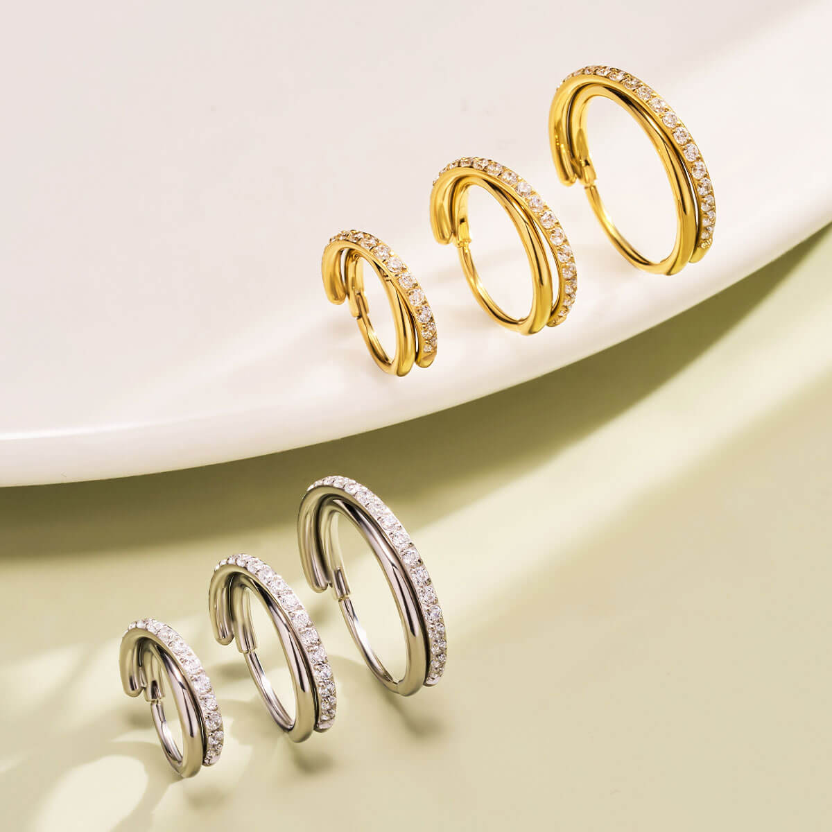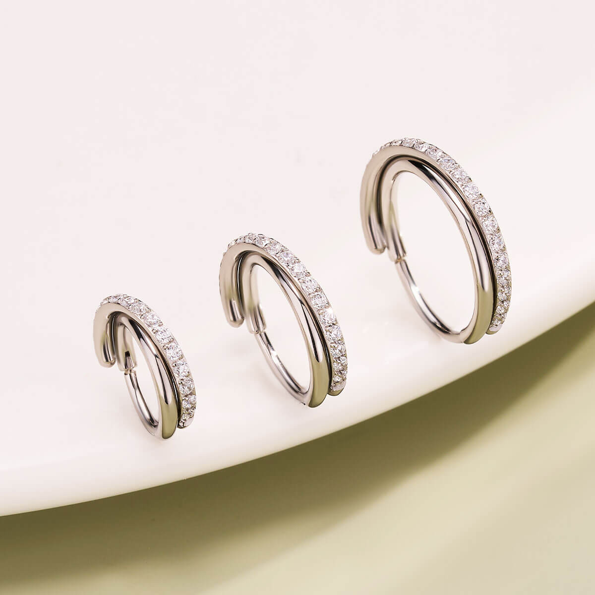 The entwined design adds a unique and stylish element to the cross nose ring, creating an intricate pattern that enhances its overall aesthetic appeal. Embedded within the design are cubic zirconi gemstones, adding a touch of sparkle and elegance to the piece. It combines functionality with fashion, offering a stylish way to adorn nose and cartilage piercings with ease and sophistication.