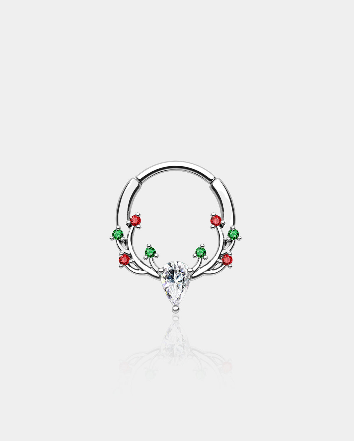 The 16G antler colorful CZ hinged segment gemstone septum ring embodies the festive spirit of the holiday season with its charming and vibrant design. The reindeer's antlers are adorned with colorful CZ stones in white, green, and red, just like the traditional Christmas colors.
