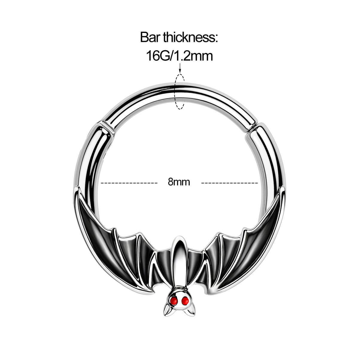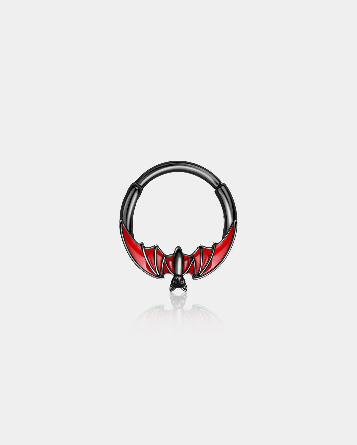 This is a bold and dramatic accessory that embodies the essence of Gothic style. This spooky septum ring features a detailed bat charm hanging upside down, capturing the eerie and mysterious nature of these nocturnal creatures. The bat’s wings are intricately crafted, with fine details that enhance its realistic appearance, making it a standout piece for those who love edgy, alternative fashion.