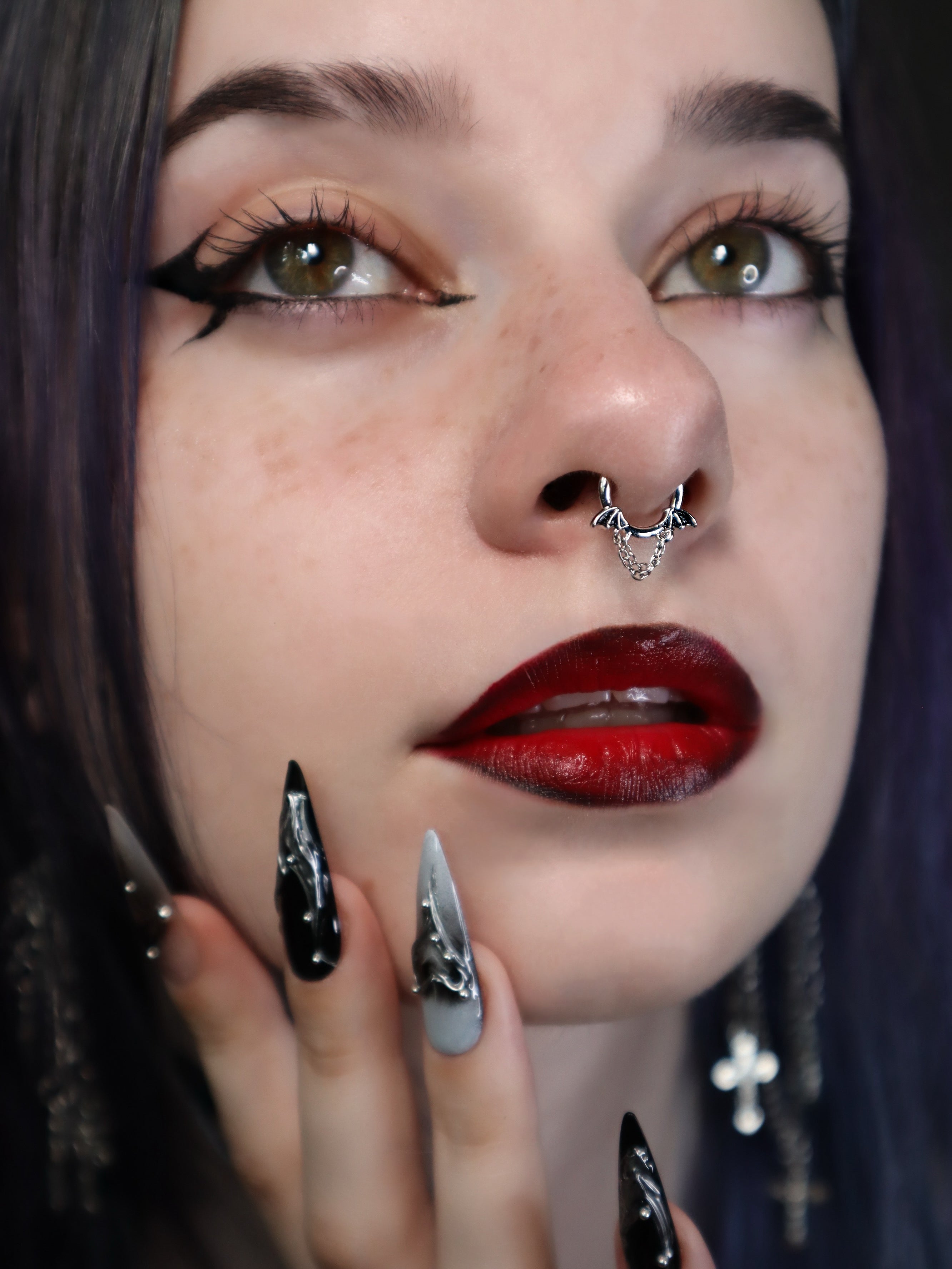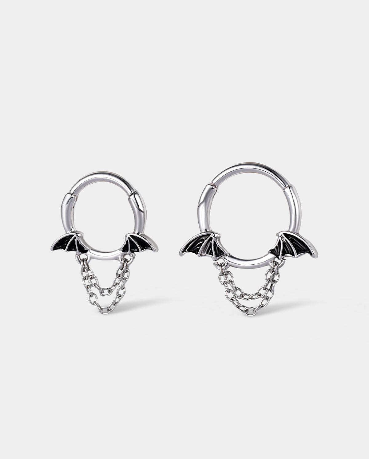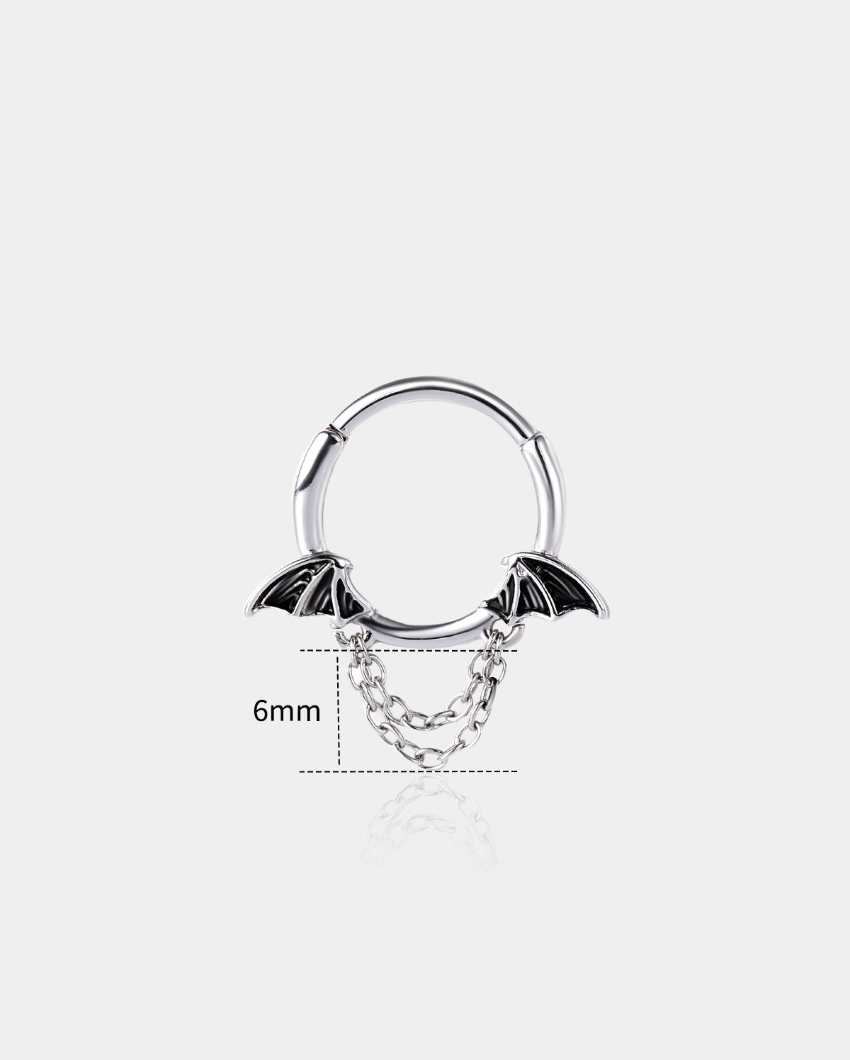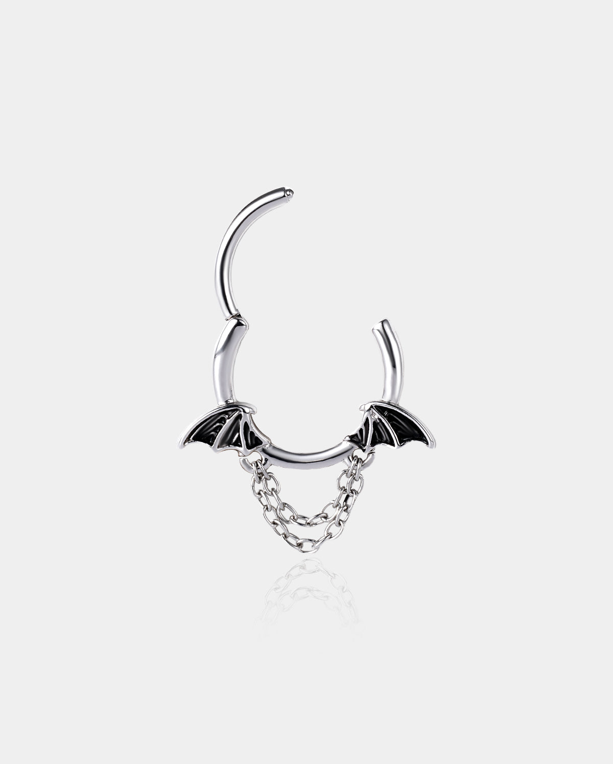 Unleash your dark aesthetic with this Gothic bat wing septum ring featuring detailed bat wings and double chains.