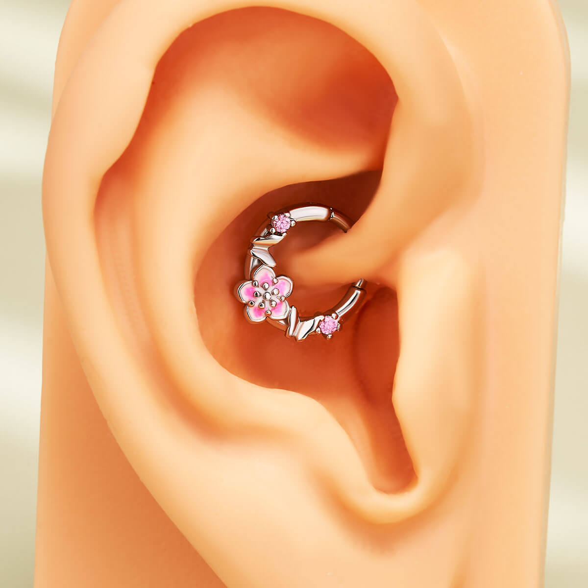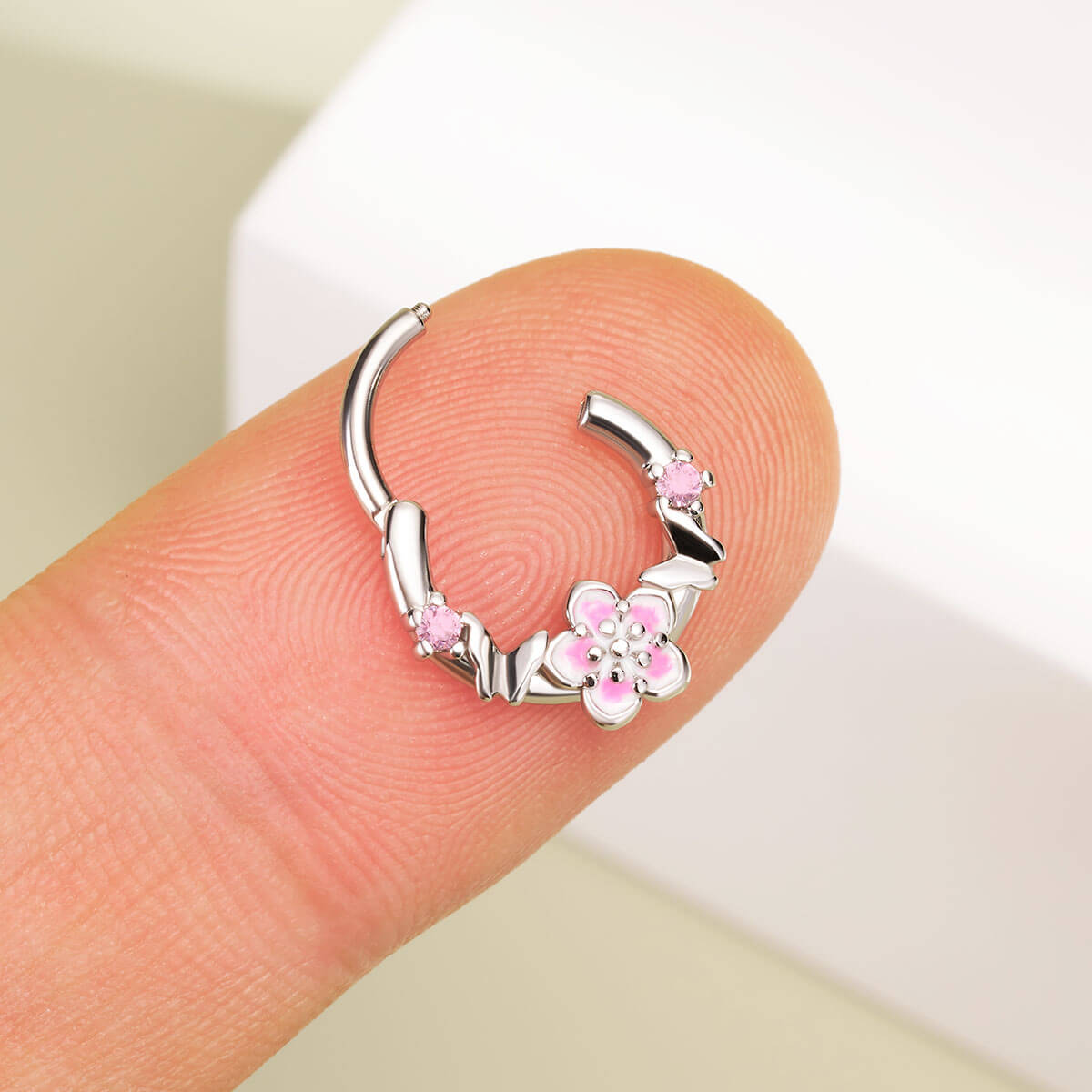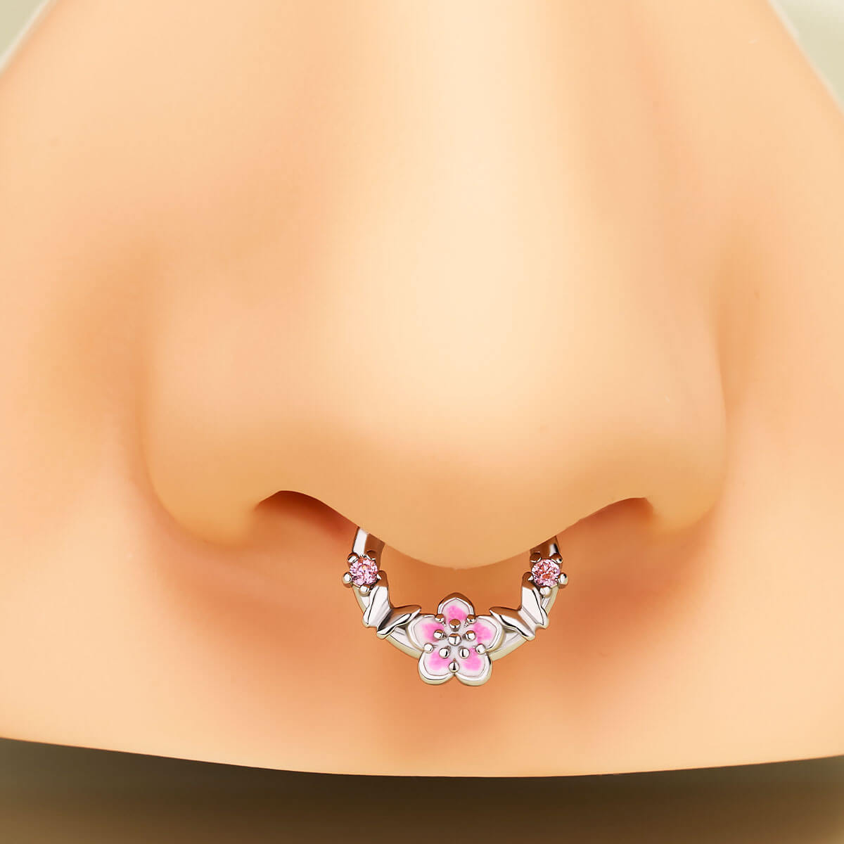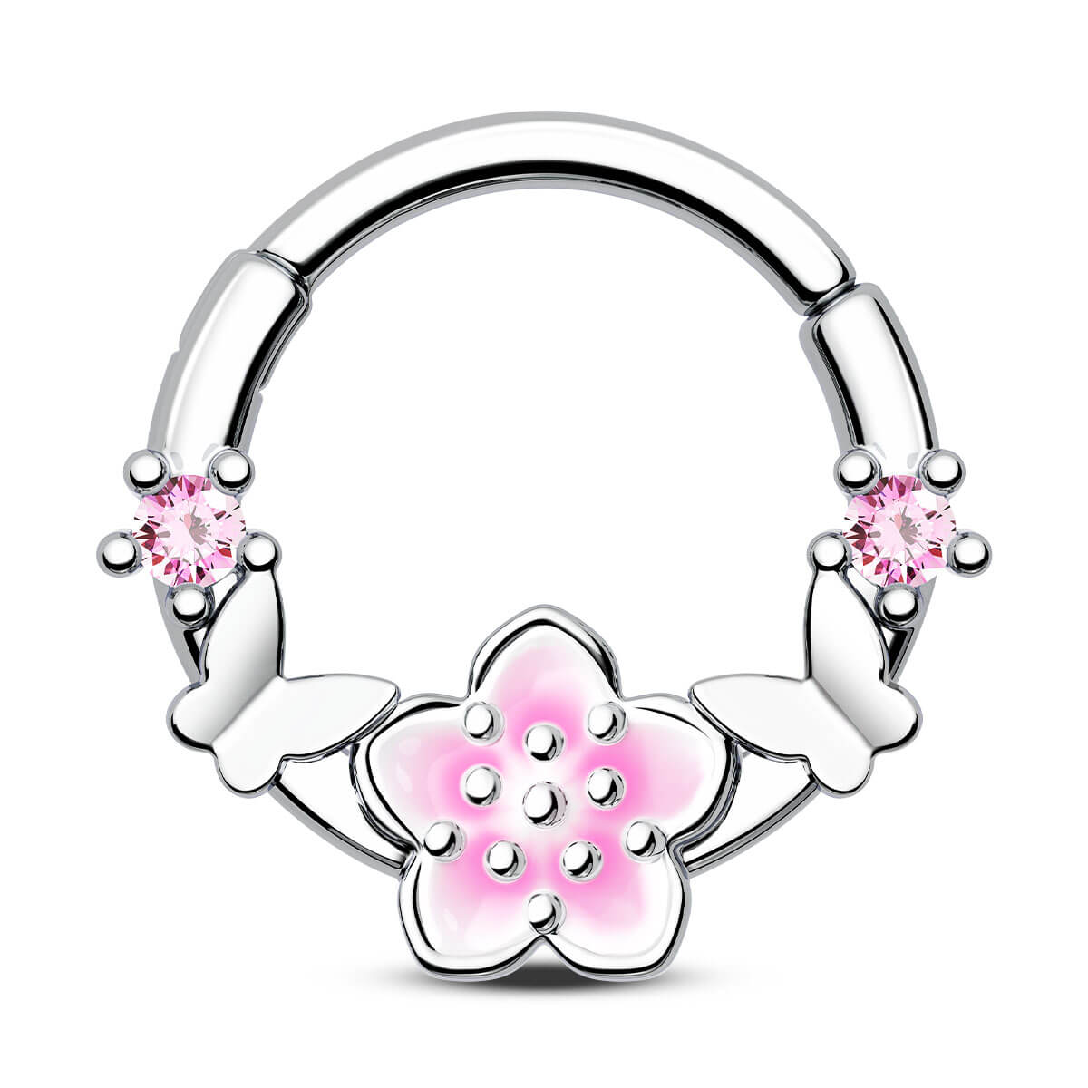 This is a delicate and charming piece of septum jewelry. The design features sleek butterflies and sakura flowers, which symbolize beauty and transformation. The hinged segment design allows for easy opening and closing of the ring, making it convenient to wear. This butterfly and sakura septum ring combines the grace of butterflies and the beauty of sakura to create a whimsical and elegant accessory for your septum piercing.
