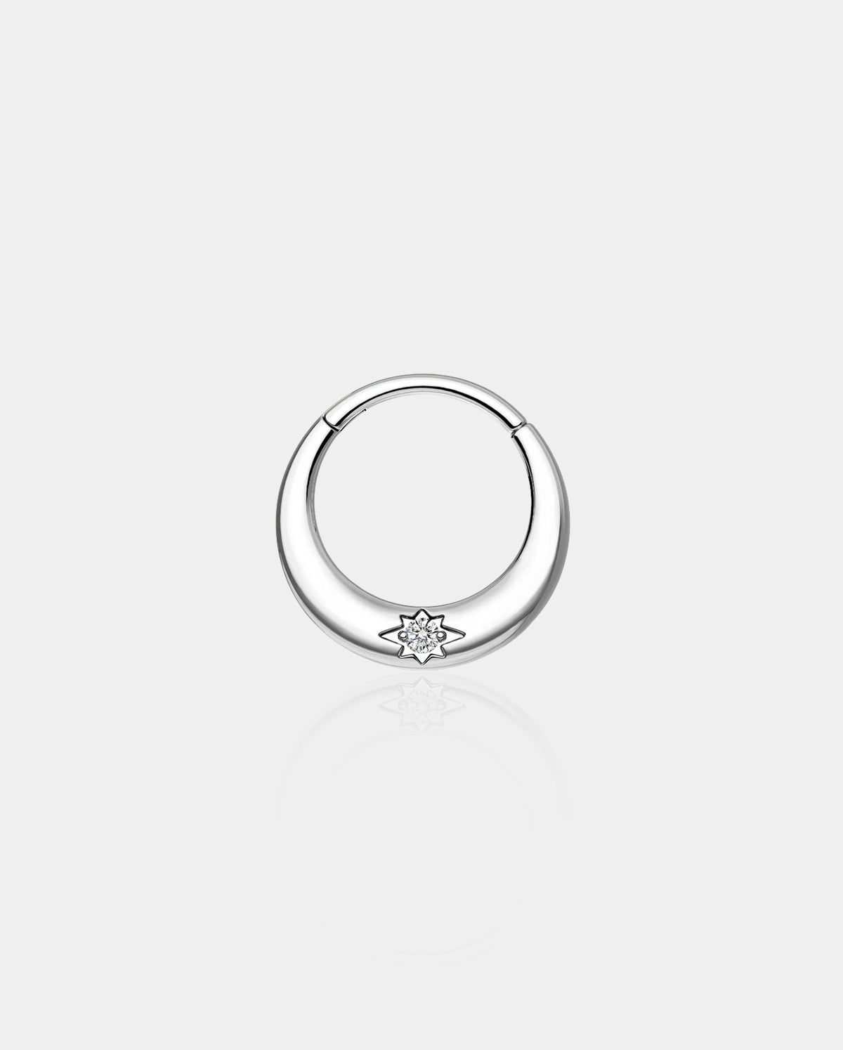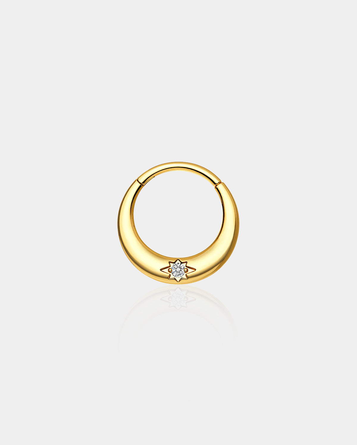 At the middle of this septum ring lies a single, dazzling cubic zirconia, carefully centered for maximum impact. The forward-facing design ensures the gemstone is prominently displayed, making it a focal point on the septum.