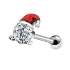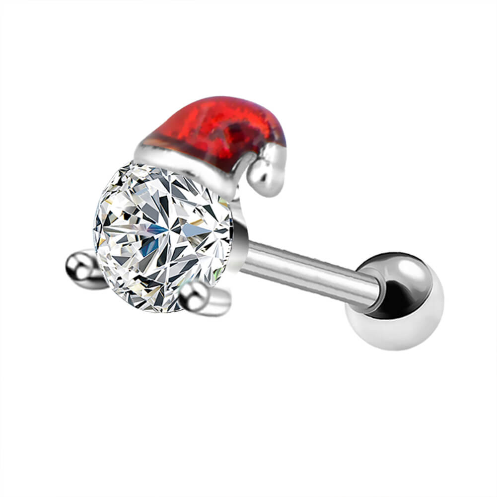 The Christmas red epoxy hat design brings you a joyful atmosphere. If you haven't caught the holiday spirit, this cartilage jewelry should definitely bring it your way! It features a single clear accent with a red Santa hat charm. Bring the holidays to your cartilage piercings with this festive jewelry.