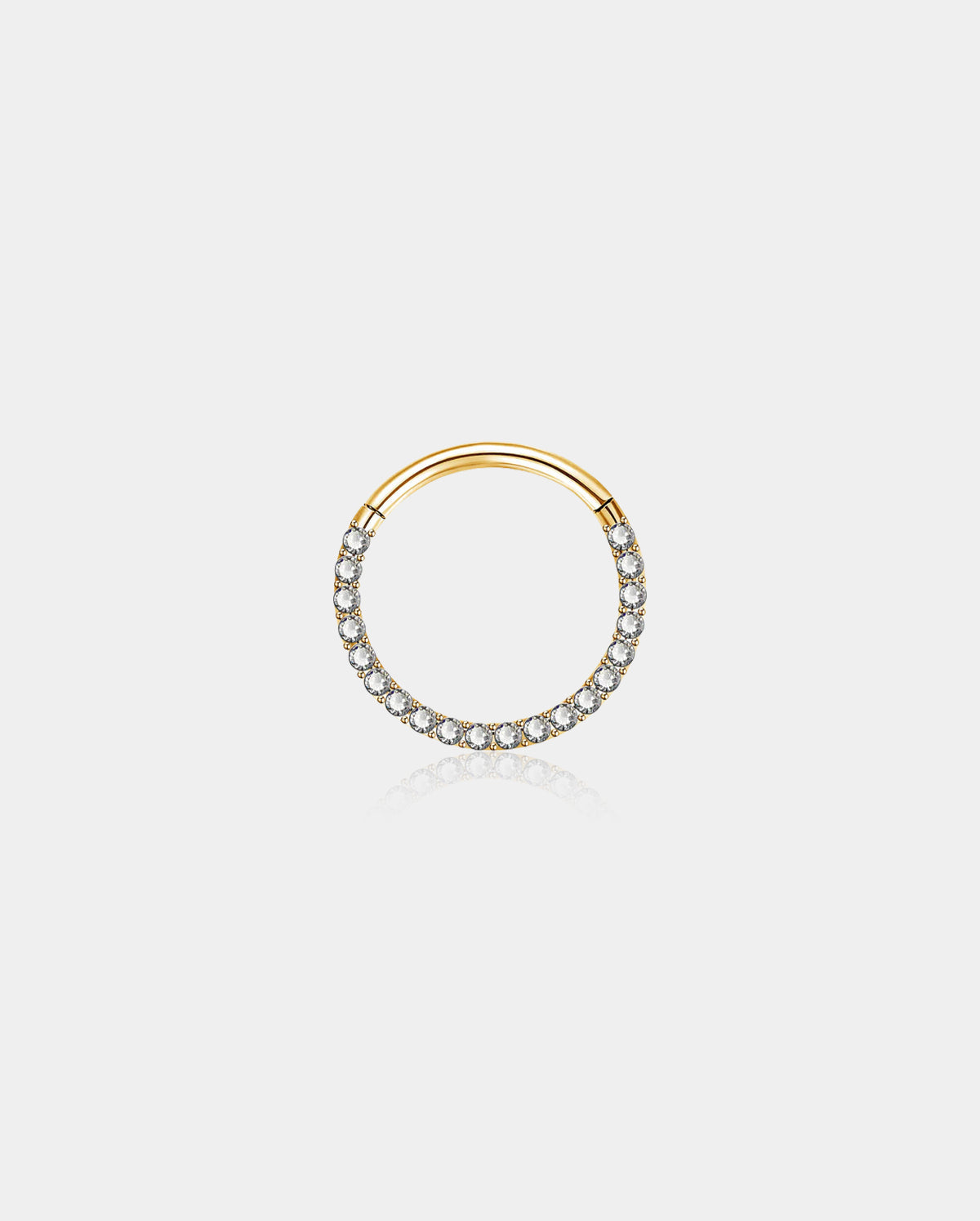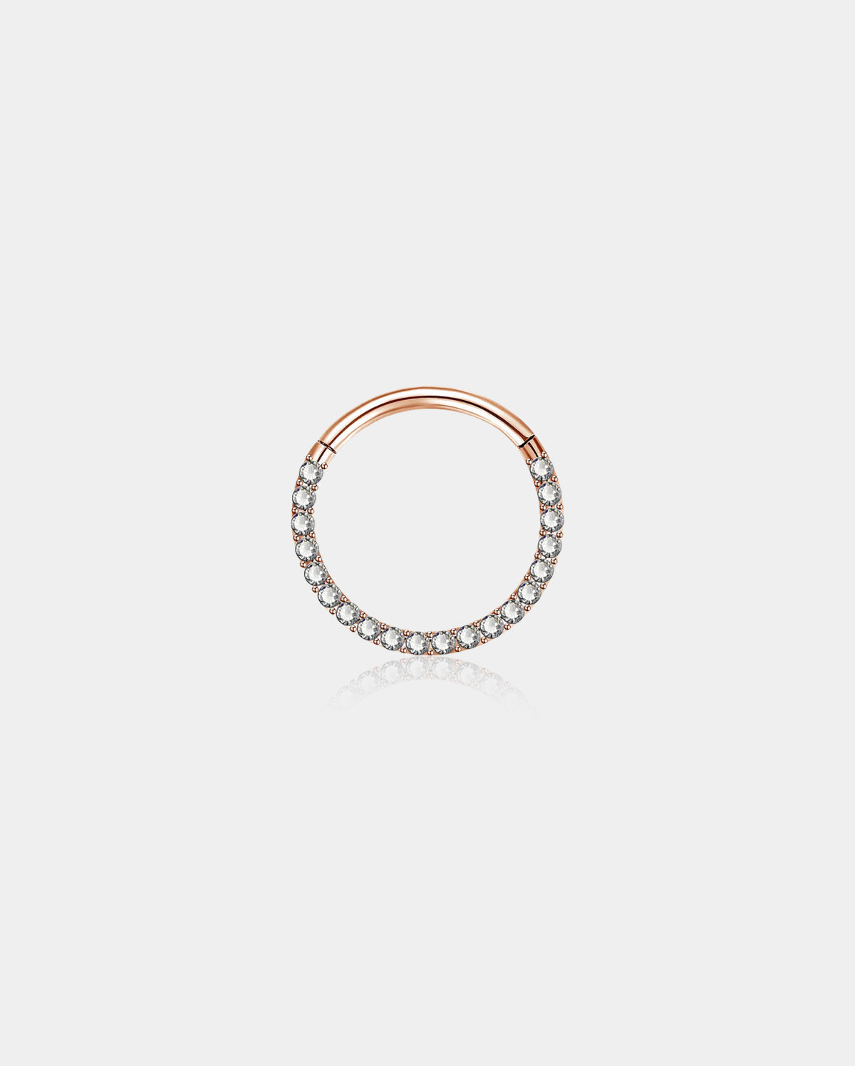 This 16G front segment septum ring features a clear cubic zirconia stone, available in silver, gold, and rose gold finishes. Designed for comfort and style, it comes in multiple sizes to ensure a perfect fit. Crafted with precision, this septum ring offers a subtle yet elegant sparkle, ideal for those seeking a refined and professional look.