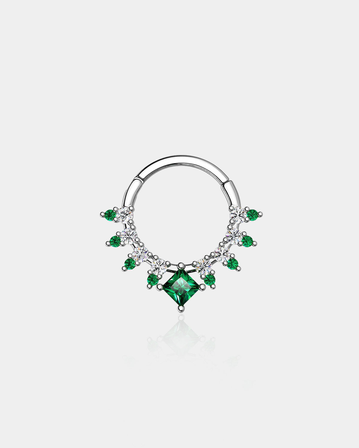 This septum ring features a symmetrical arrangement of CZ stones, offering a balanced and dazzling aesthetic. The hinged segment design ensures easy insertion and secure closure, providing convenience and style.