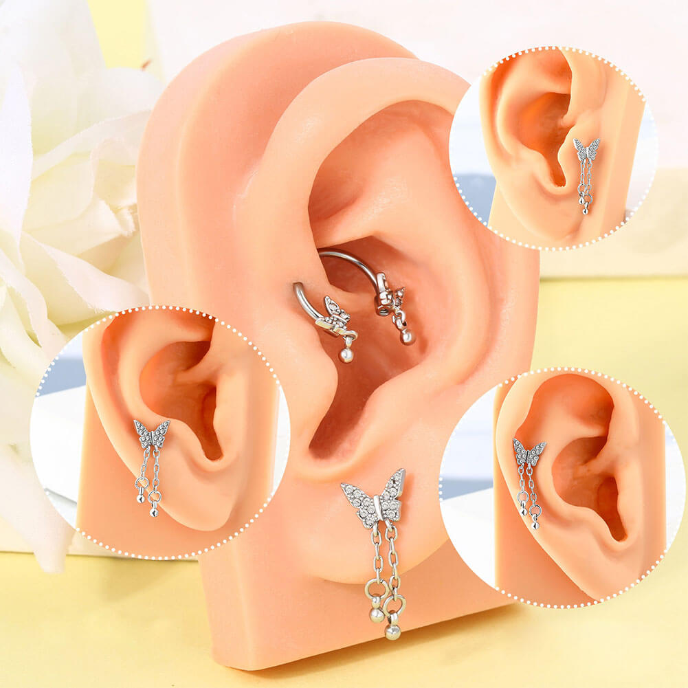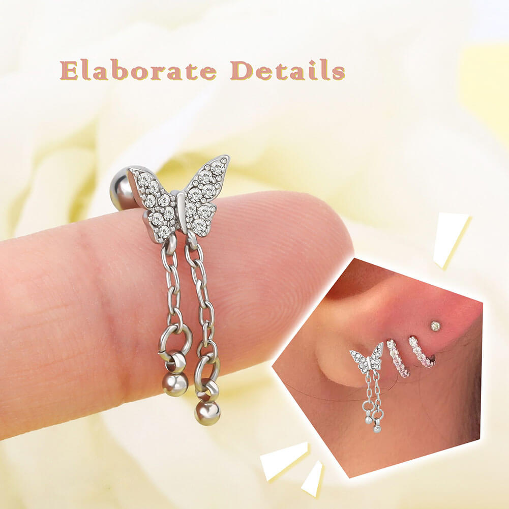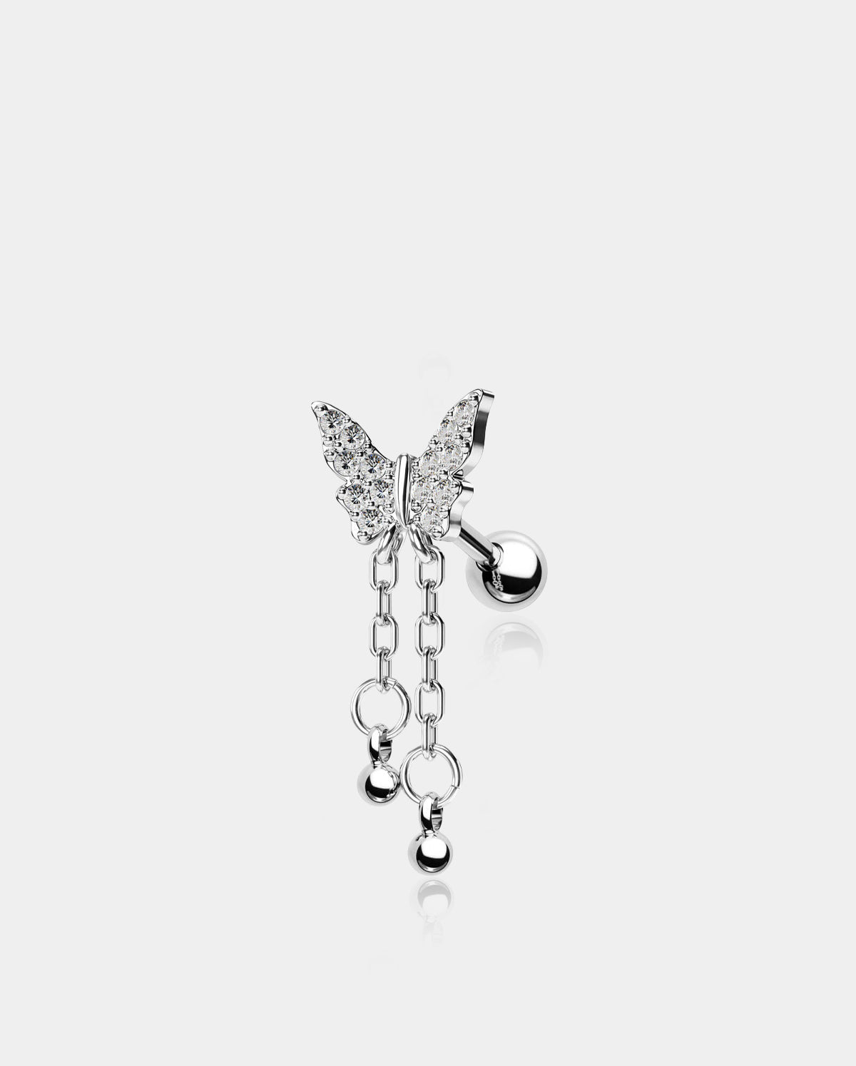 Bedeck your piercing with such a shiny butterfly helix earring stud. It features an exquisite butterfly top-end paved with clear accents for an extremely opulent look, also with 2 little balls dangling under the butterfly. Catching all eyes on you with this gorgeous cartilage stud.
