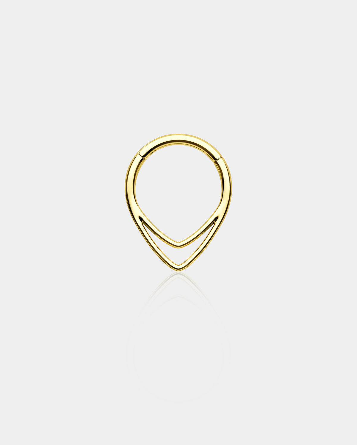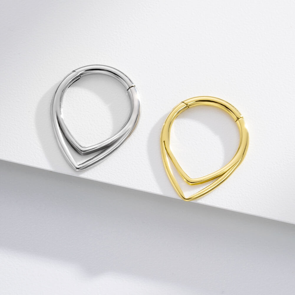 The double hoop triangle septum ring adds a refreshing and sleek touch to the classic design. This septum ring is a versatile accessory that can complement any outfit or style. Its timeless design makes it suitable for both casual and formal occasions. Whether you want to add a touch of elegance to your everyday look or make a statement at a special event, this double oval-shaped hinged segment septum ring is a perfect choice.