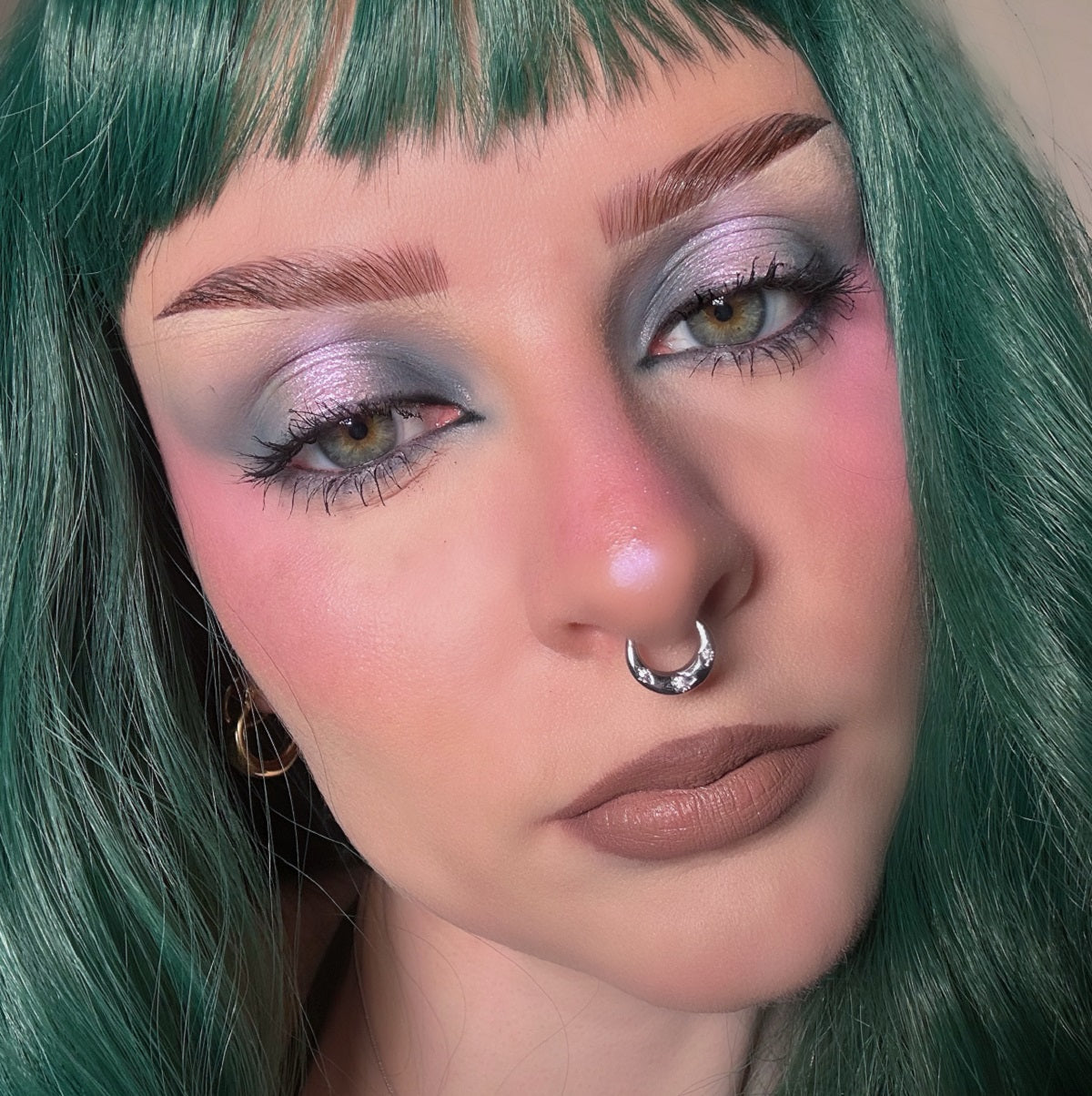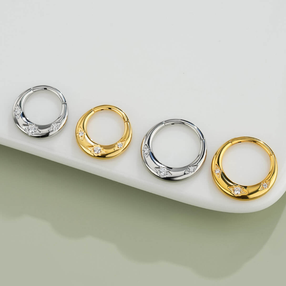 This septum ring features three round cubic zirconias set in a forward-facing design, ensuring maximum visibility and a brilliant display of light. The ring's band is adorned with intricate engravings, adding a depth of texture and a unique, artisanal quality.