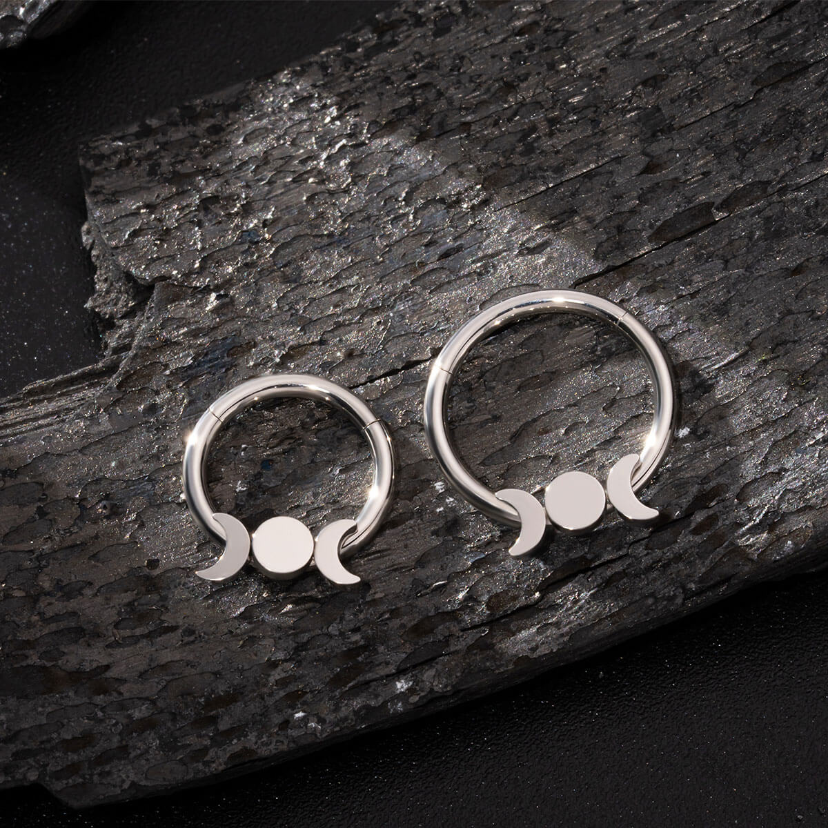 This is a unique and stylish piece of stainless steel septum ring that showcases the enchanting beauty of the moon phases. Crafted with attention to detail, this septum ring features a flat design with intricately carved lunar phases, creating a celestial and mystical vibe.