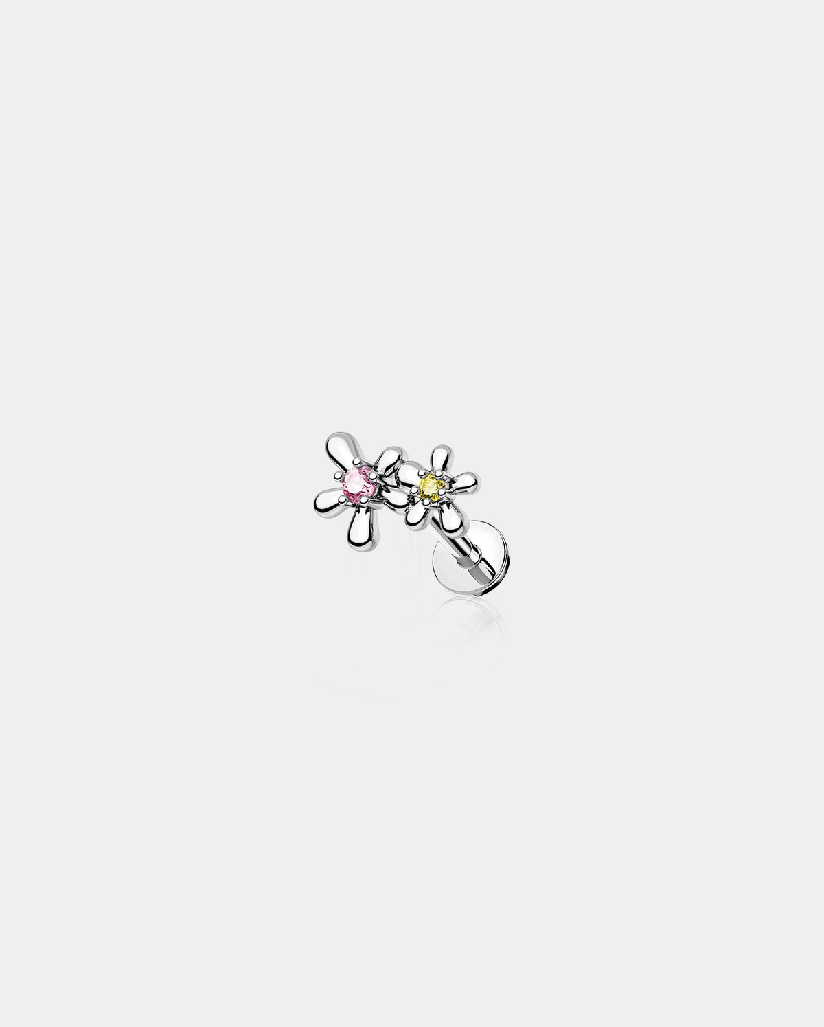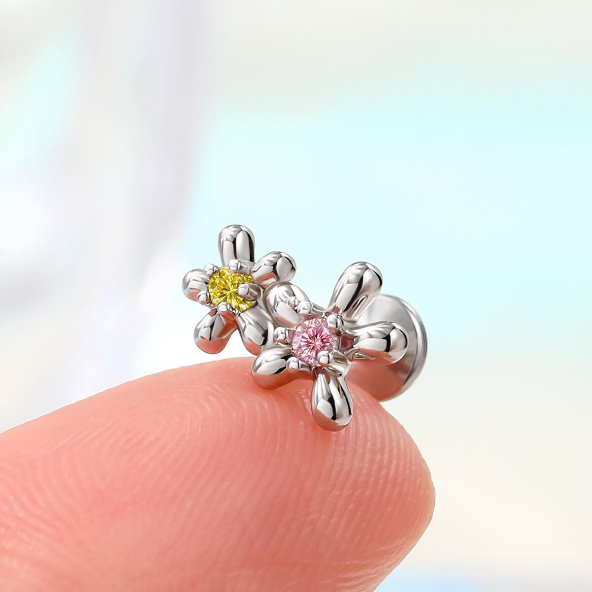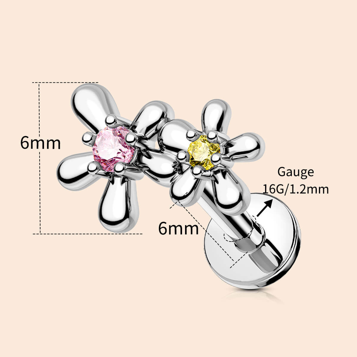 The two-flower helix stud top is a standout feature, exuding an air of femininity and cuteness. It is adorned with colorful cubic zirconias in the center, adding a touch of glamour and playfulness. The 16G helix labret stud is internally threaded, ensuring a secure fit, and providing both comfort and peace of mind, making it ideal for daily wear. Perfect for helix, tragus, or conch piercings.