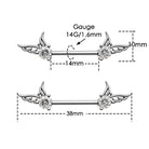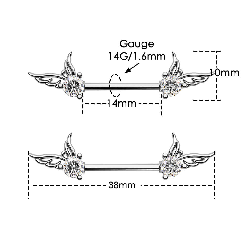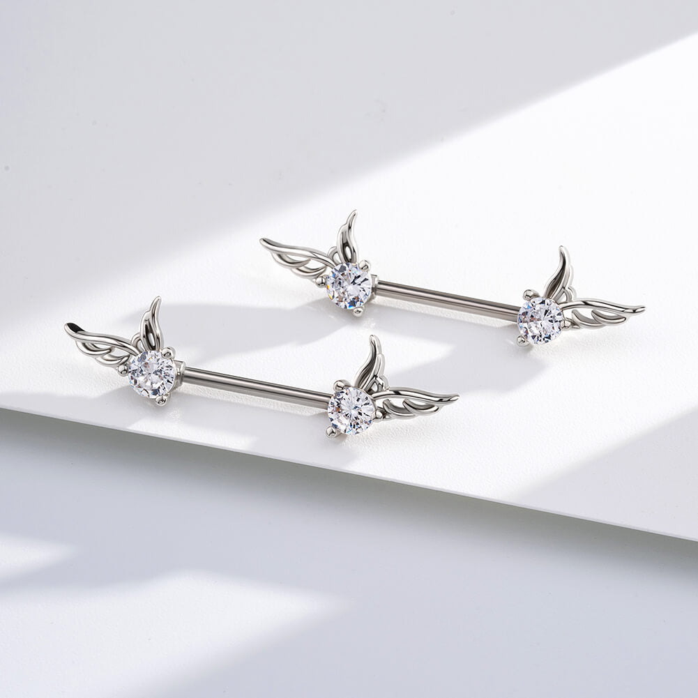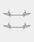 This flying wings nipple piercing barbell set features a barbell design with two ends, each adorned with a clear cubic zirconia gemstone inside the flying wings. The overall style is bold and angelic. It emanates the warrior spirit strongly.