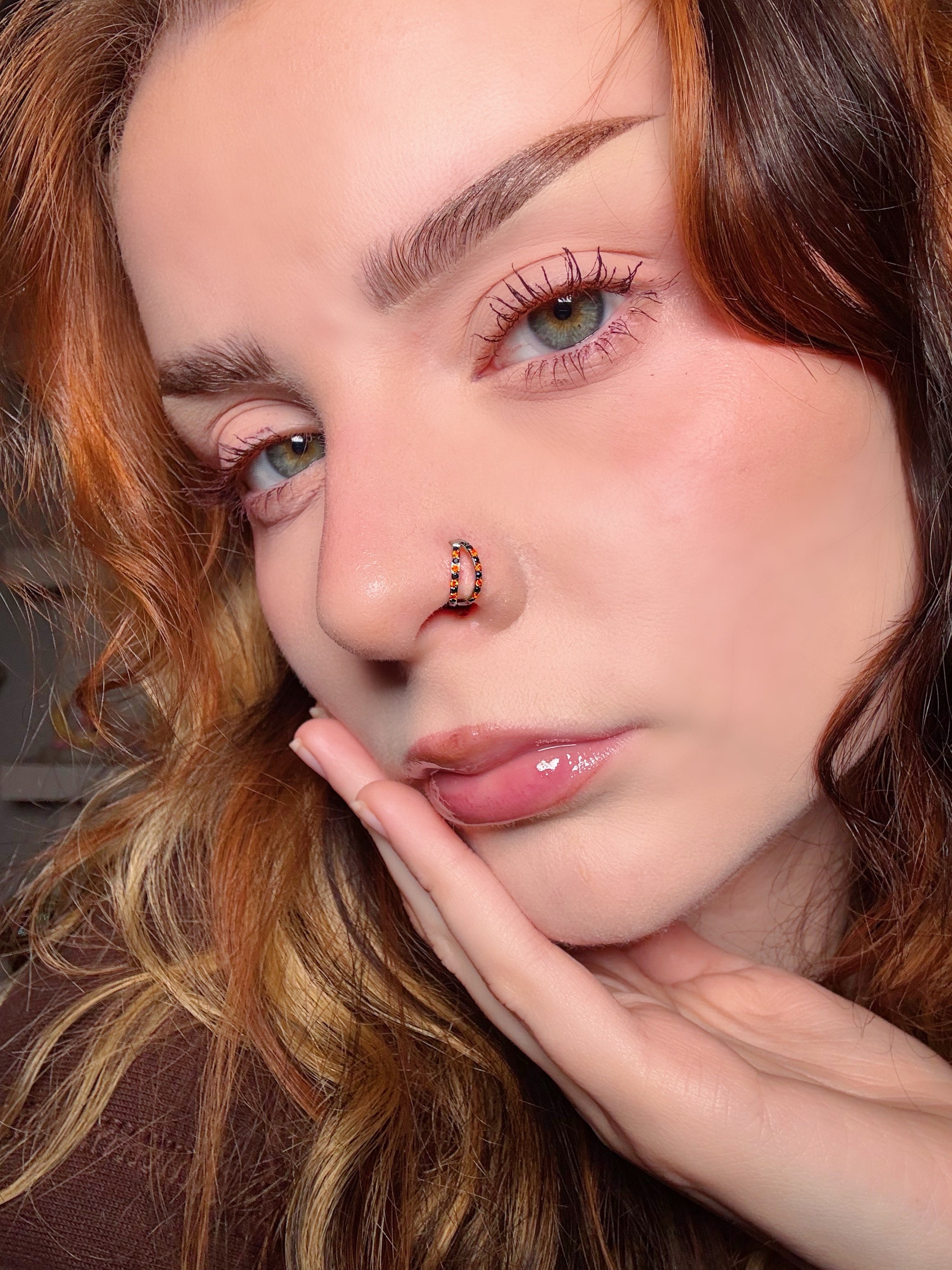 This festive and eye-catching accessory is designed to bring a touch of Halloween cheer to your look. This double-hoop Halloween nose ring features two hoops adorned with vibrant Halloween-themed colors. Perfect for celebrating the Halloween season or adding a fun, whimsical element to your everyday style.