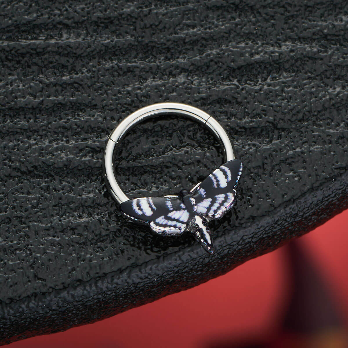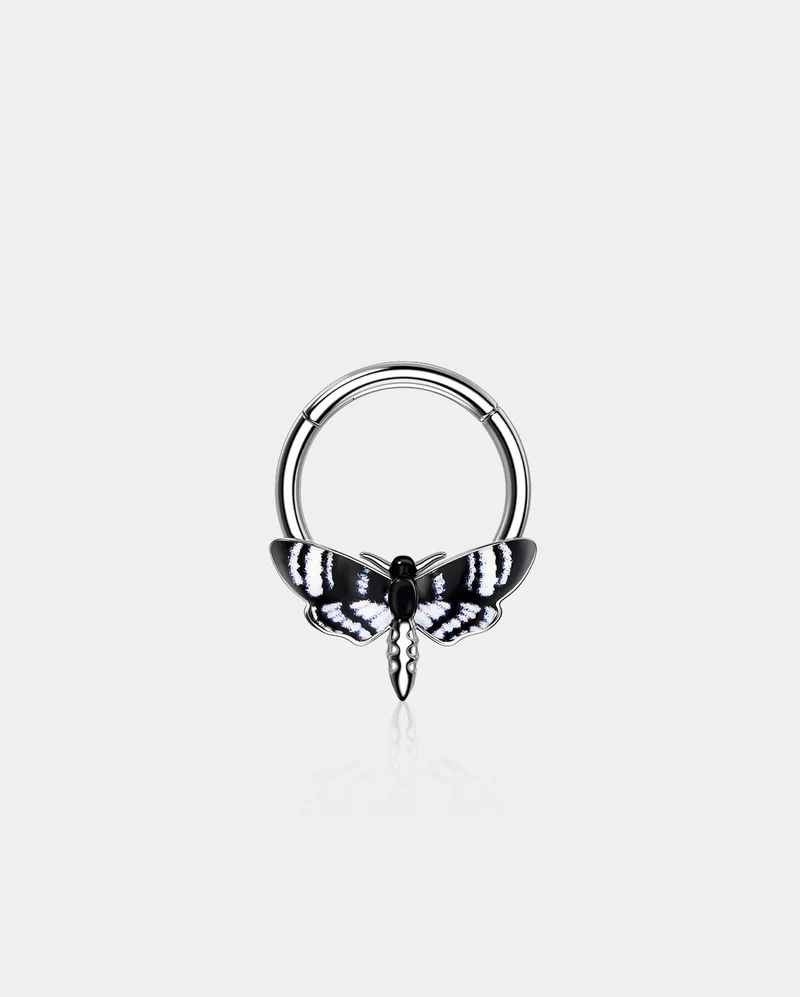 This is a striking and intricate piece of body jewelry that exudes a sense of elegance and mystique. Designed with a detailed hawk moth motif, this septum ring features delicate, wing-like patterns that capture the beauty of this nocturnal insect. Its finely detailed design adds a touch of sophistication and a hint of nature-inspired allure to your septum piercing, making it a standout accessory for those who appreciate unique and captivating jewelry.