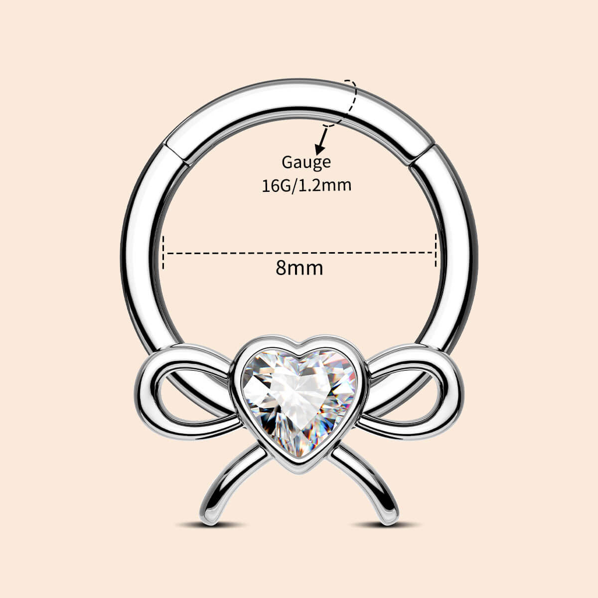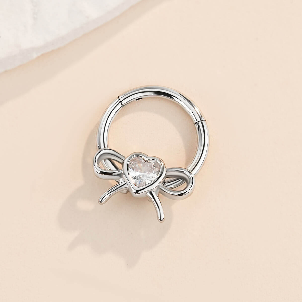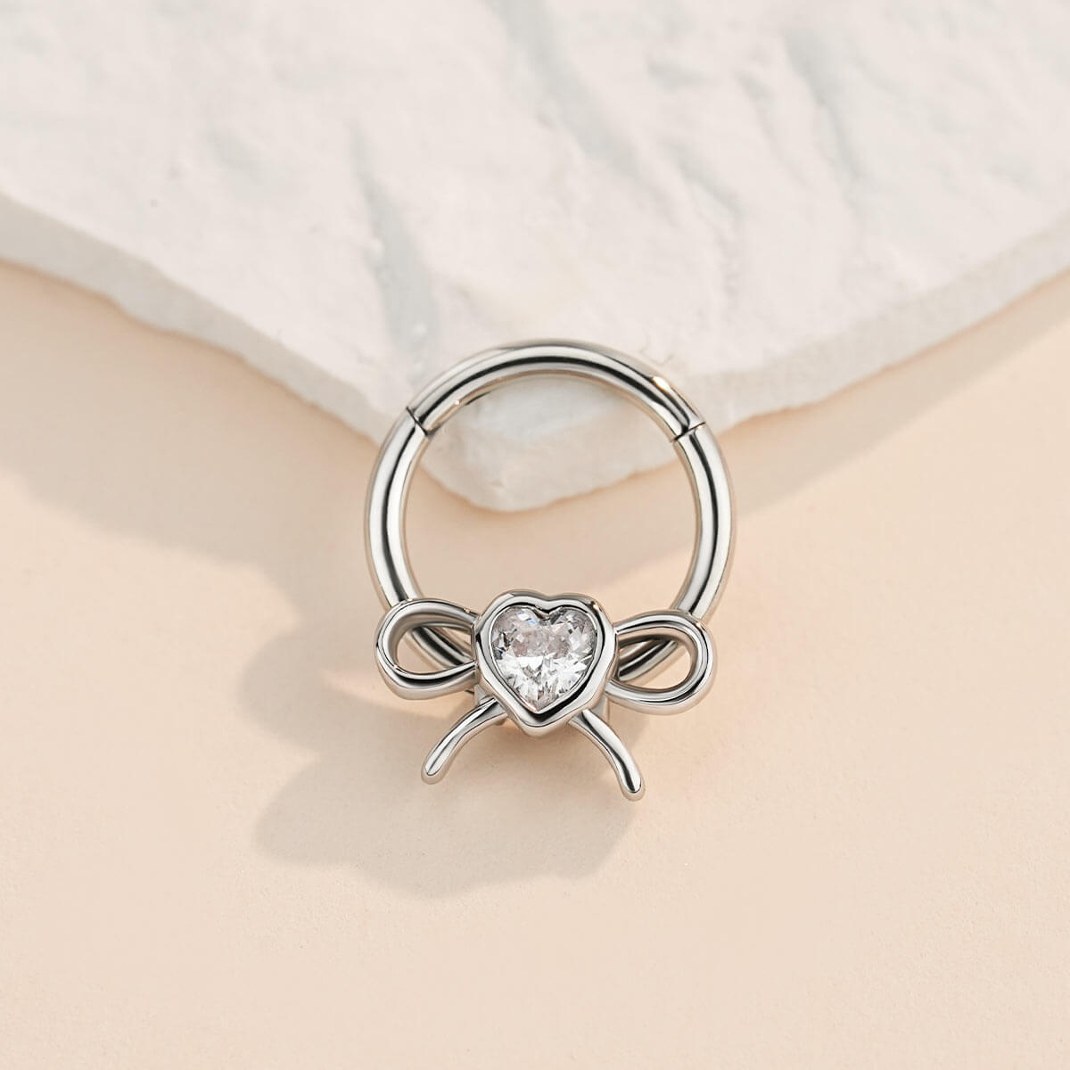 The septum ring features a bow- shaped frame that delicately curves, mimicking the elegant flow of a tied ribbon. In the middle, a heart-shaped cubic zirconia stone steals the show, radiating a brilliant sparkle. Its lightweight construction ensures comfort during extended wear, allowing you to express your individuality through a unique, eye-catching design.