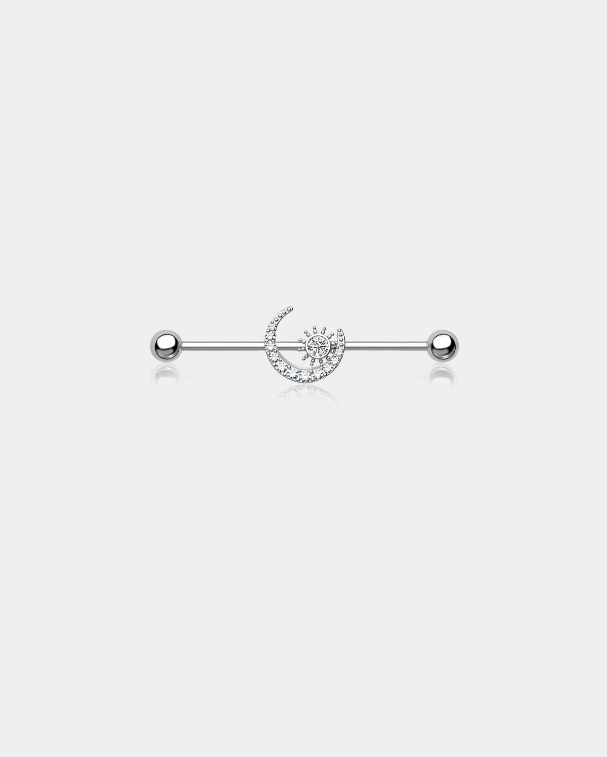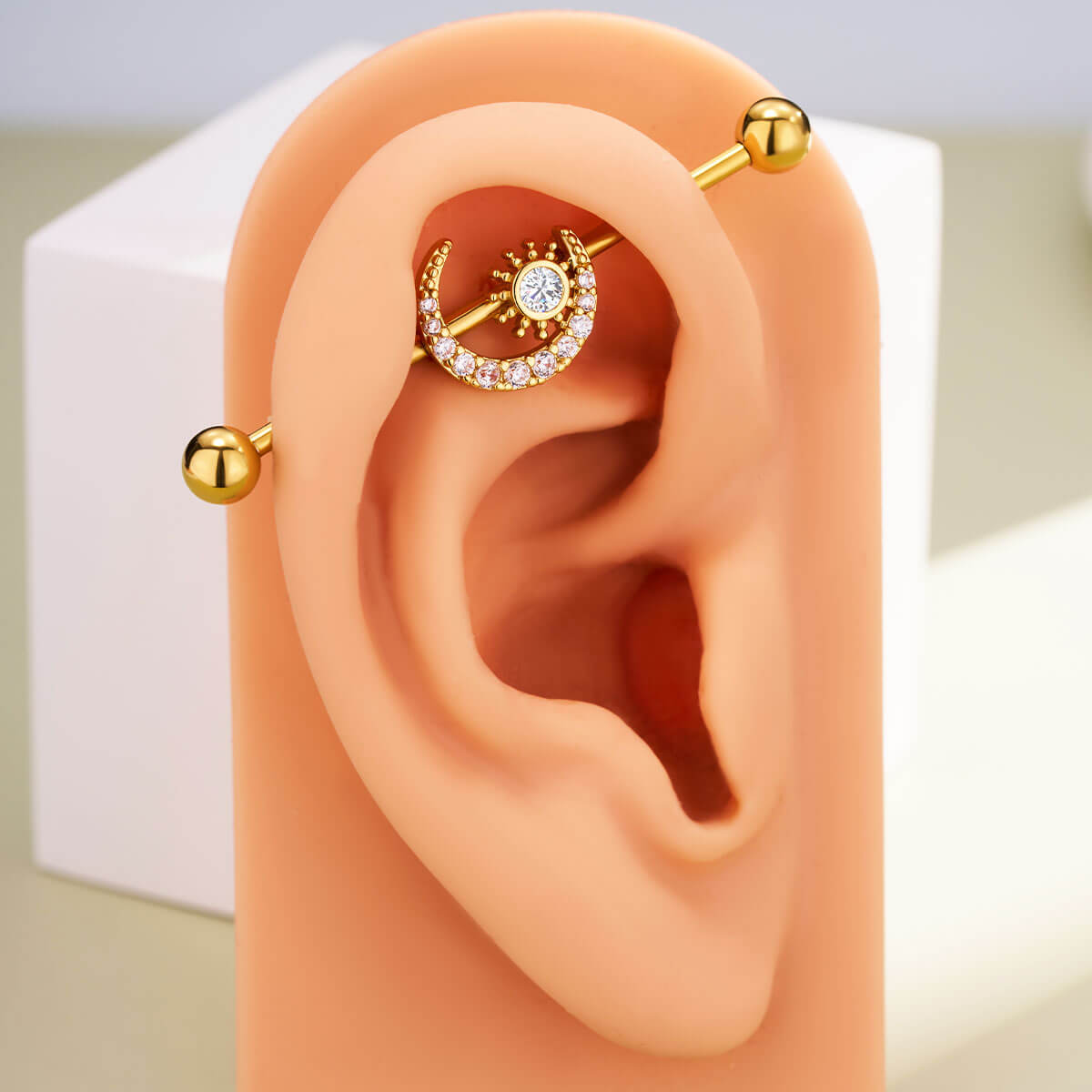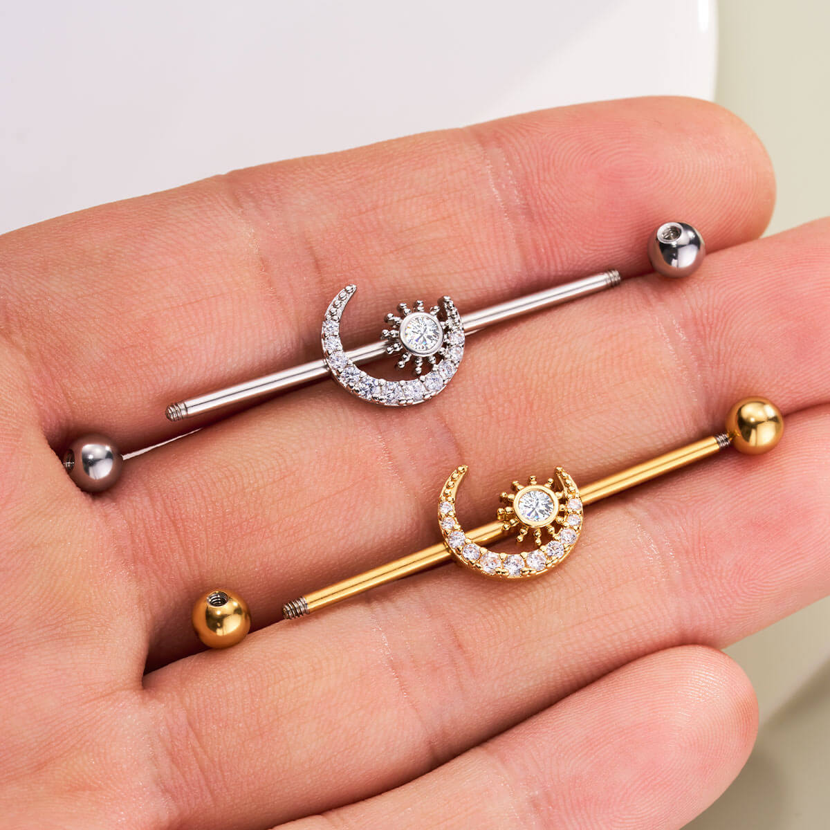 This sun and moon industrial barbell is a captivating piece of body jewelry that perfectly combines celestial elegance with contemporary style. With the sun and moon ensemble, this barbell not only serves as a striking accessory but also embodies a sense of balance and harmony, making it a unique and meaningful addition to any jewelry collection.