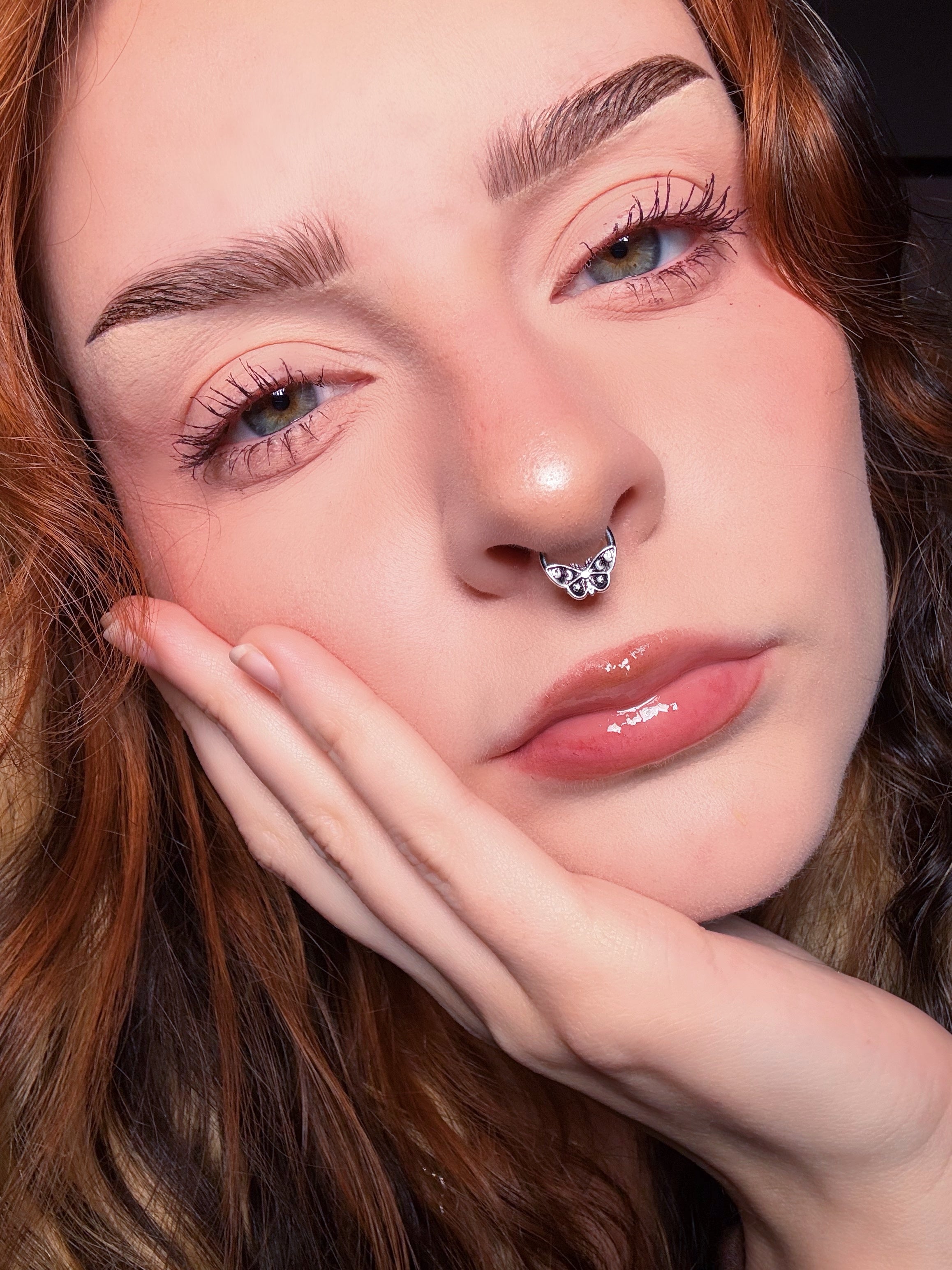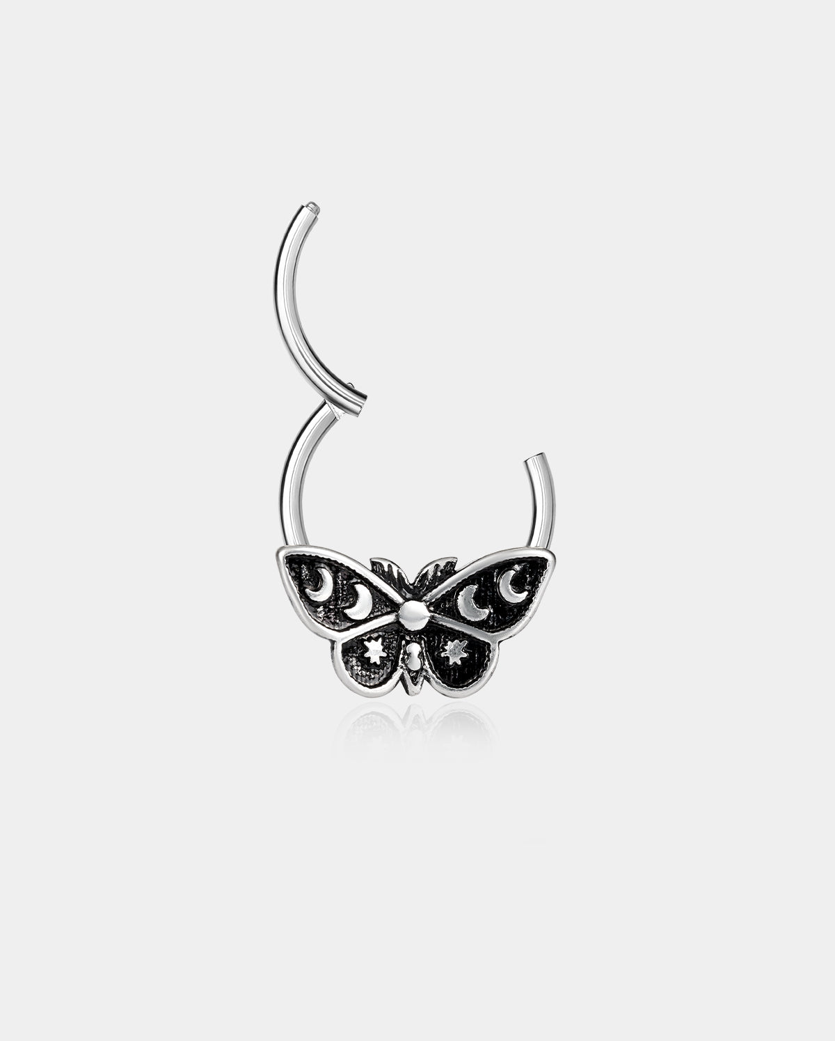 ● This gothic-style black moth septum ring clicker combines crescent moon and star motifs for a dark, enchanting vibe.