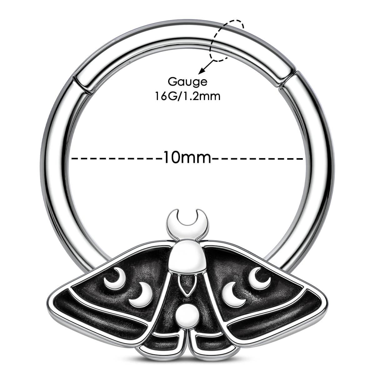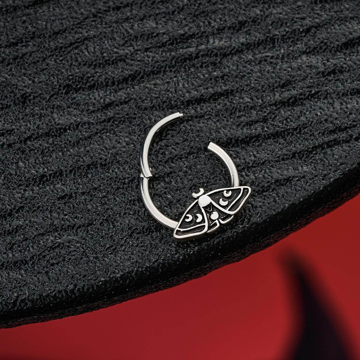 This moon wing moth septum ring features a delicately crafted moth with wings that resemble crescent moons, symbolizing transformation and the cycles of life.
