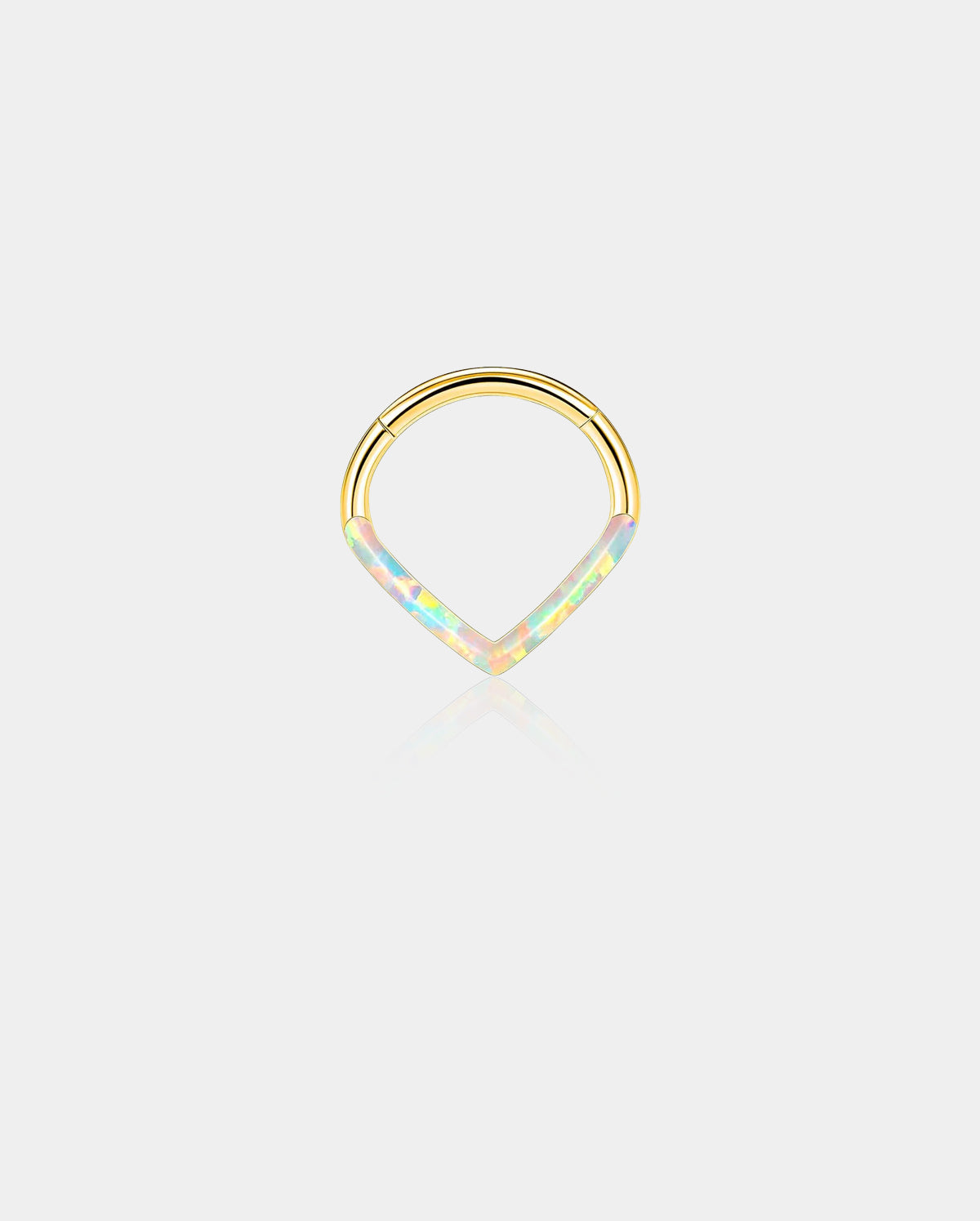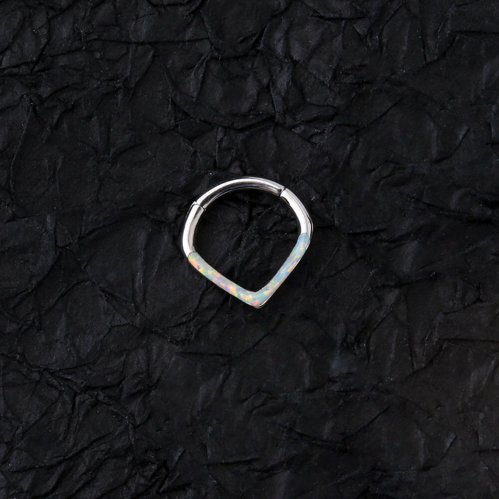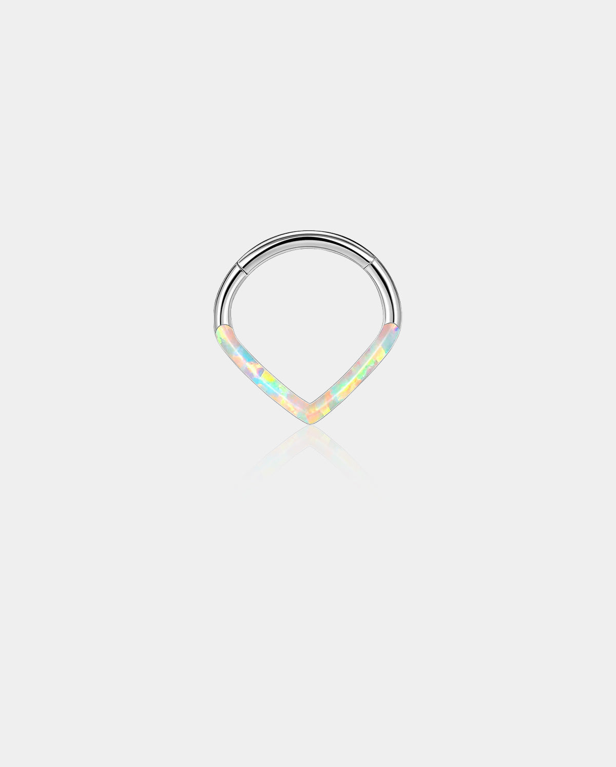 A triangle septum ring is always the best choice for those who want to make your nose look more three-dimensional. Improve the glamour of your cartilage piercings with the simple elegance of this 16 gauge clicker jewelry! It features a V shape at the bottom of the hoop, paved on V-shape front facings with integral white opal gem.