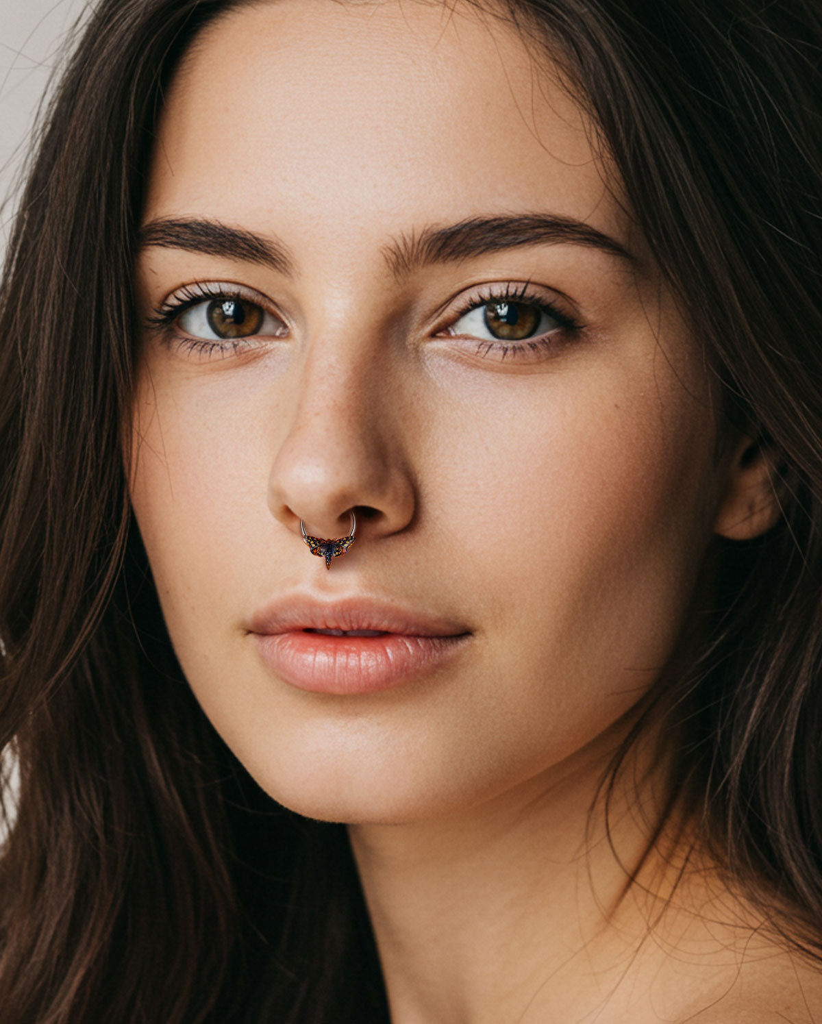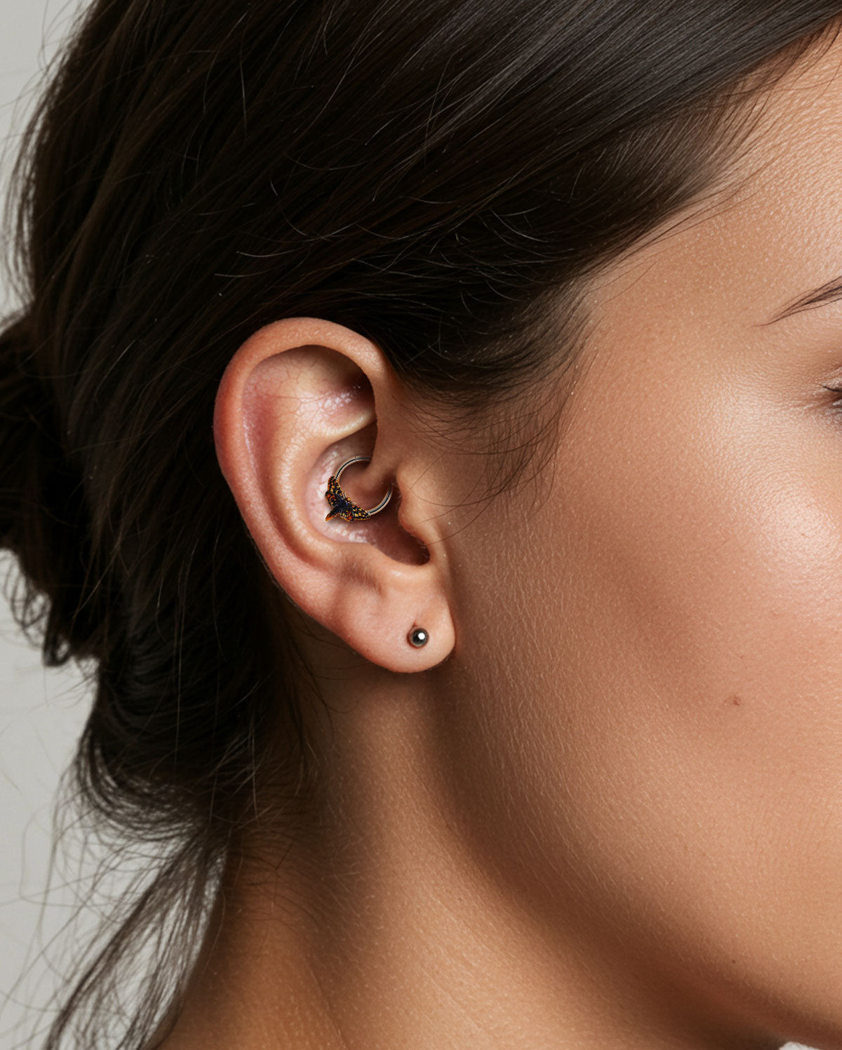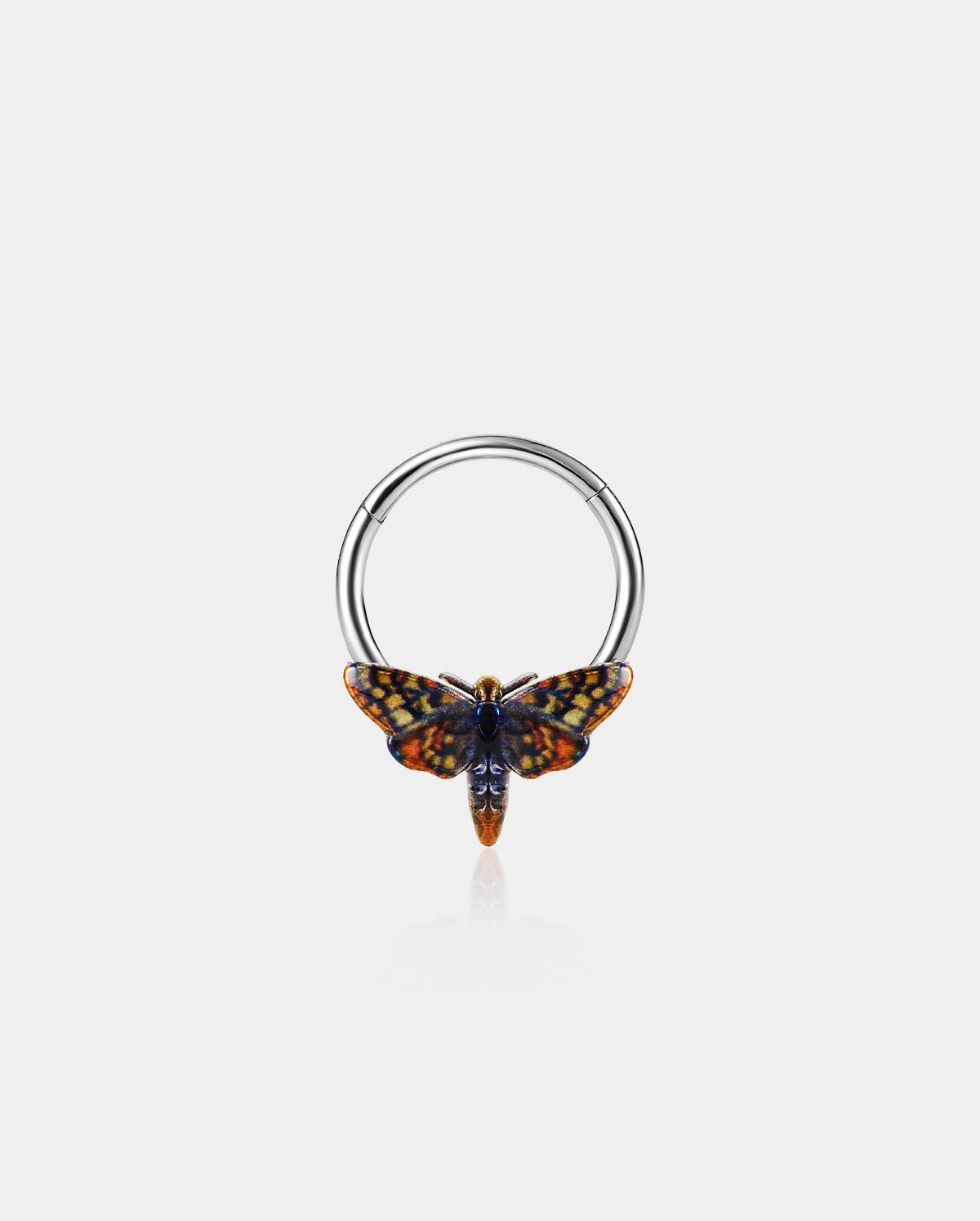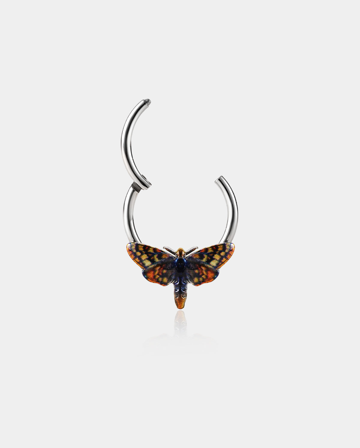 This 16G orange moth segment daith septum ring is crafted from 316L stainless steel for a hypoallergenic, corrosion-resistant, and comfortable fit.