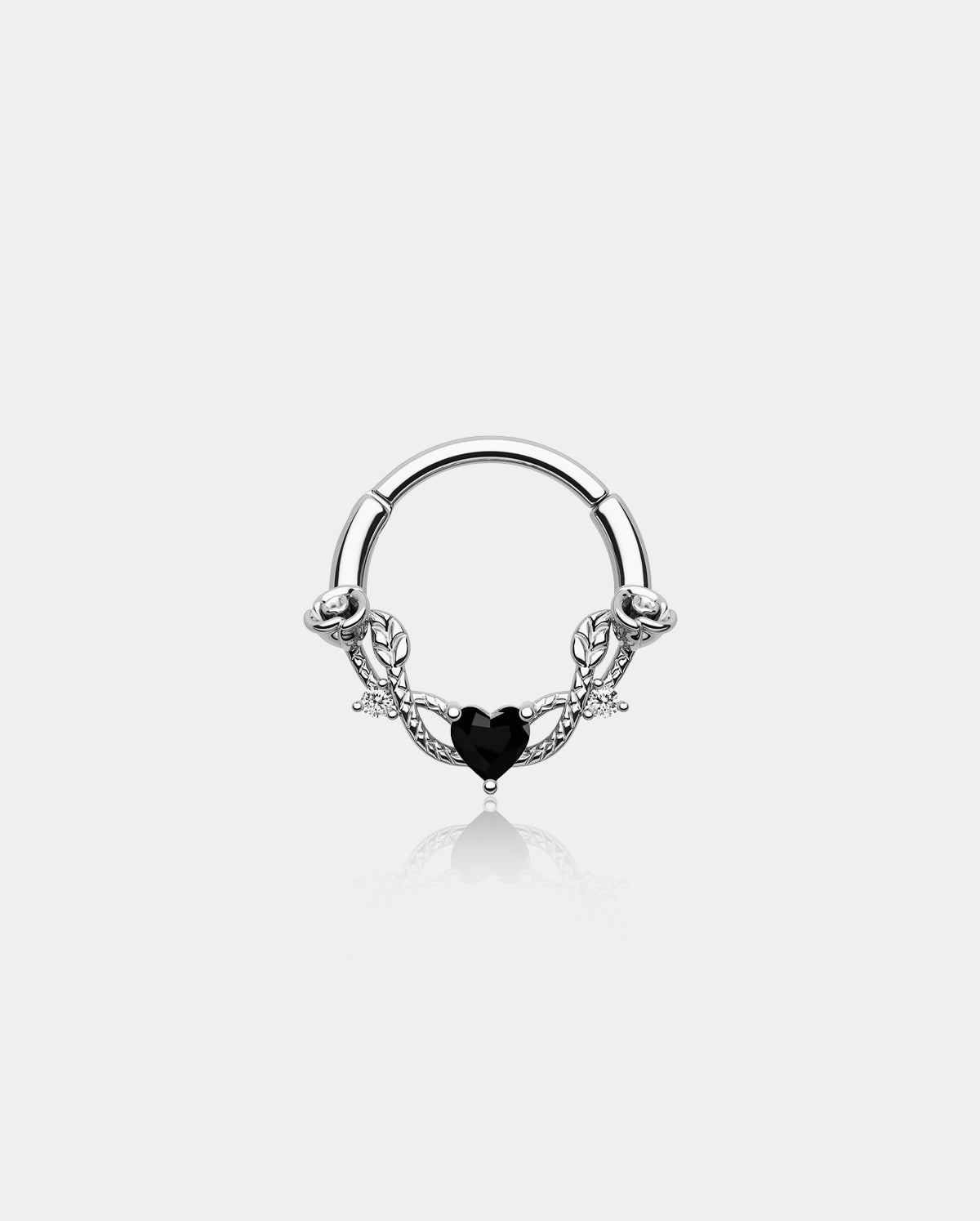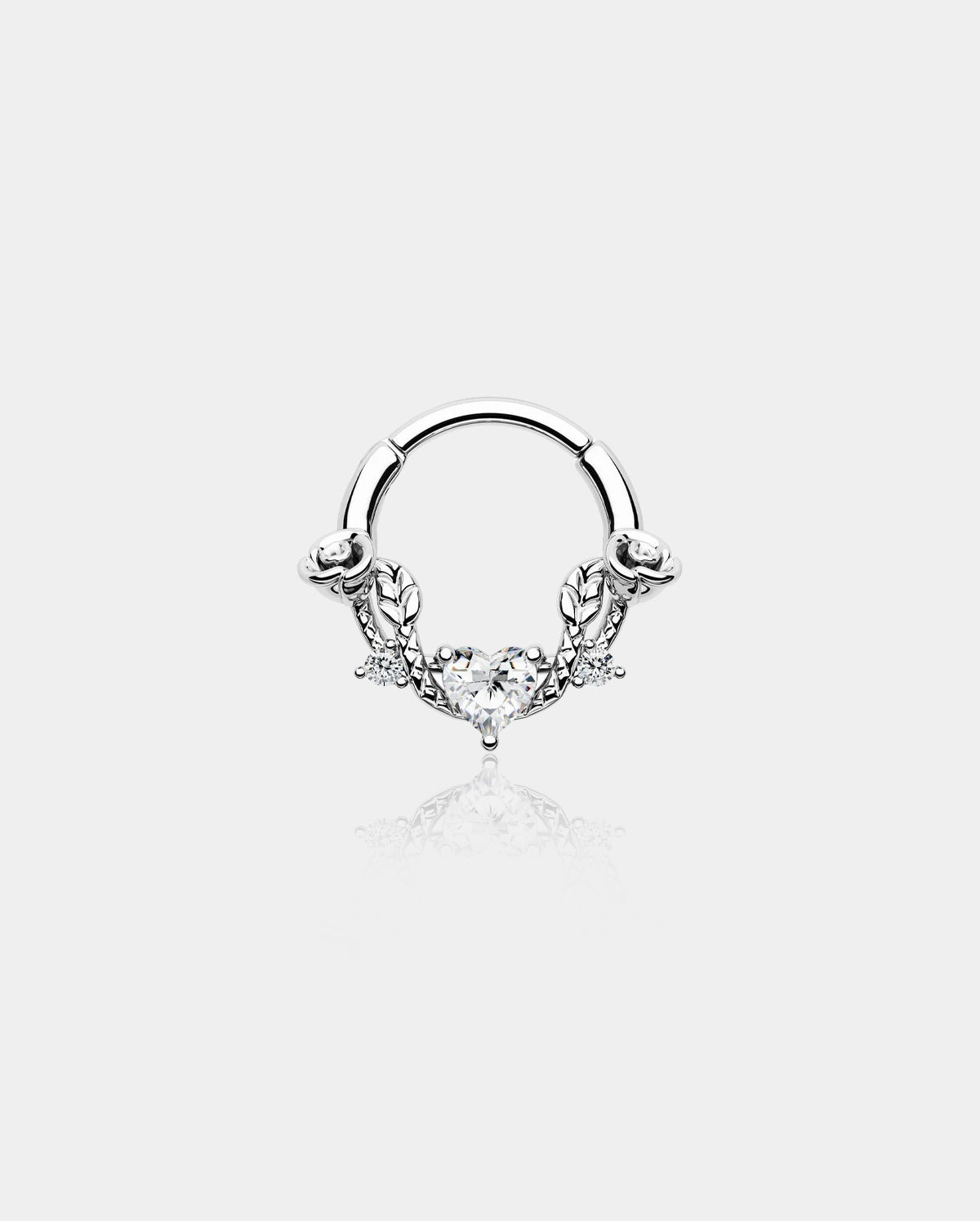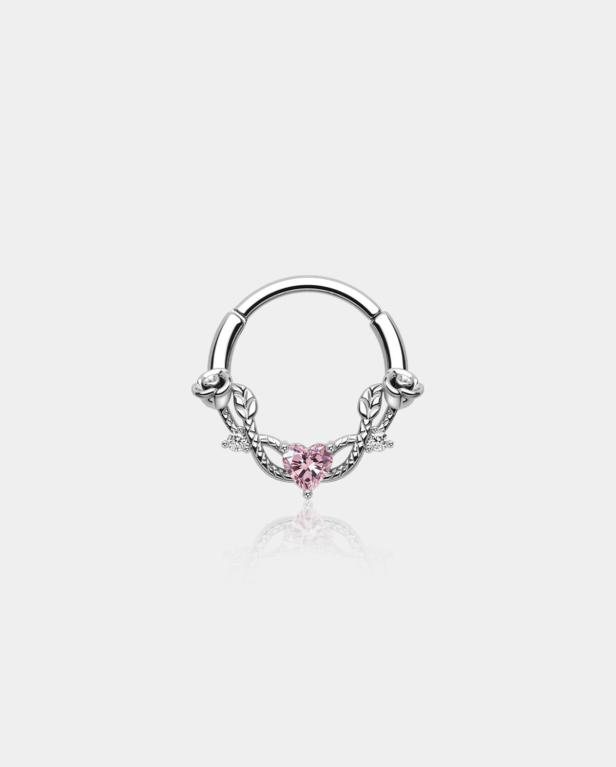 This clicker-style rose septum ring is made of 316L stainless steel, the design is inspired by the Roma love story, there are roses and vines across the hoop, and in the middle is a shiny CZ heart.