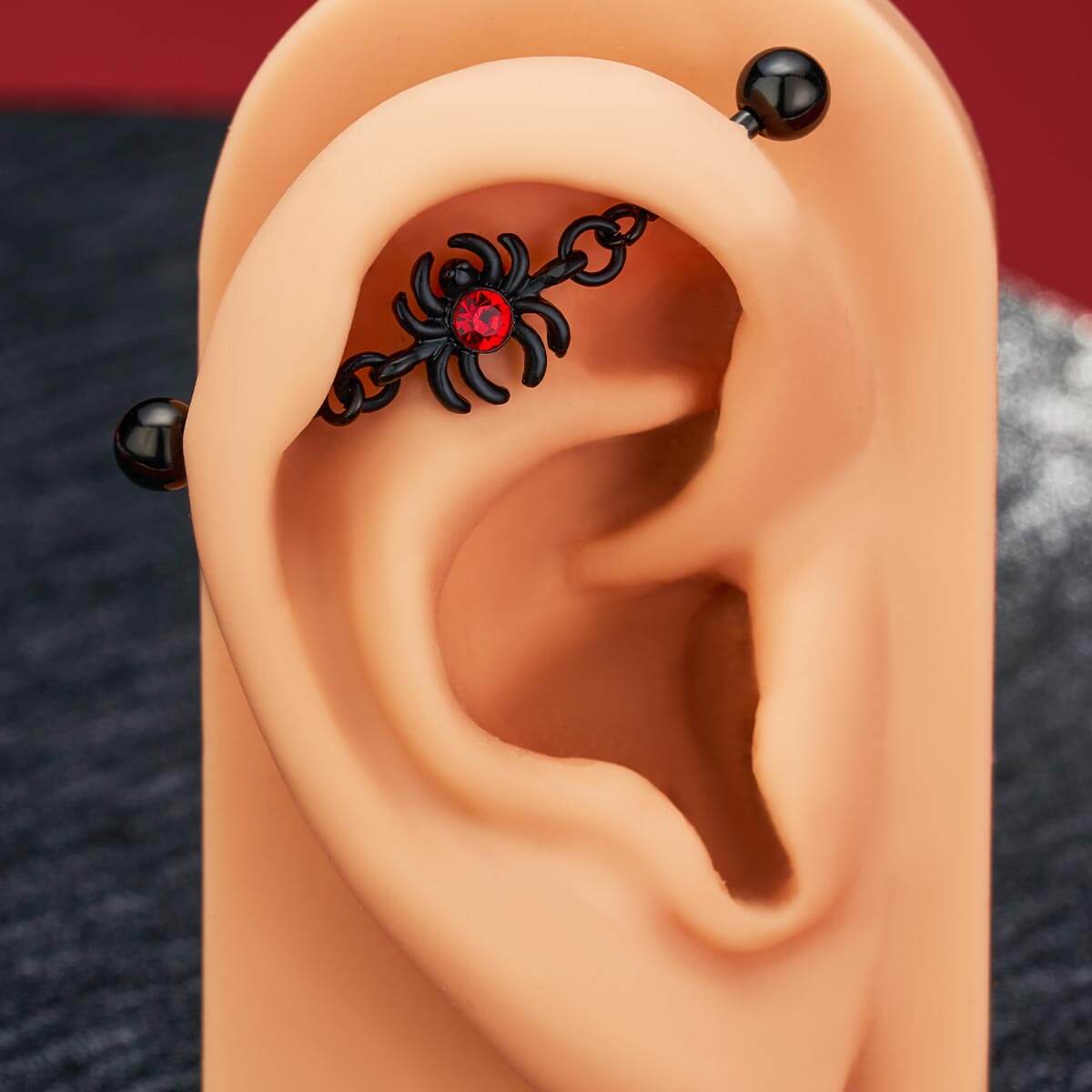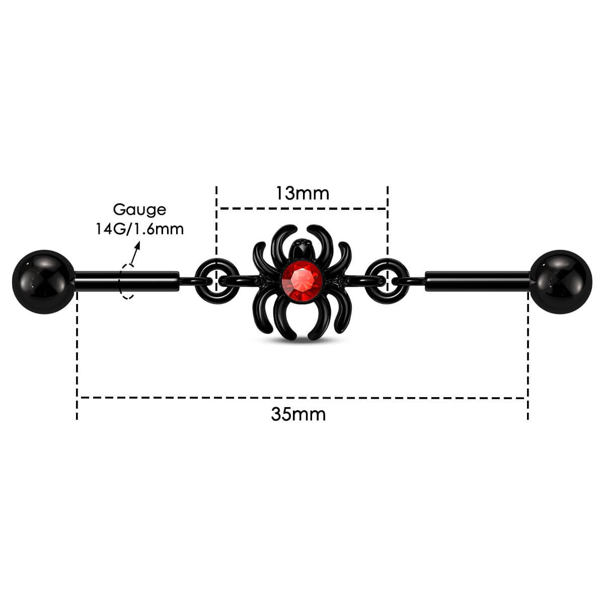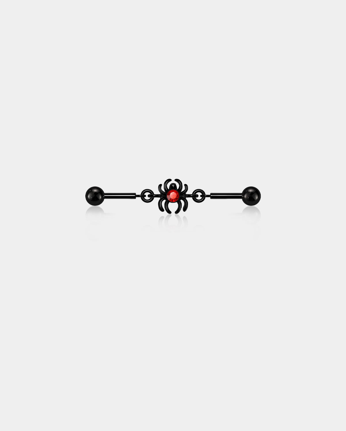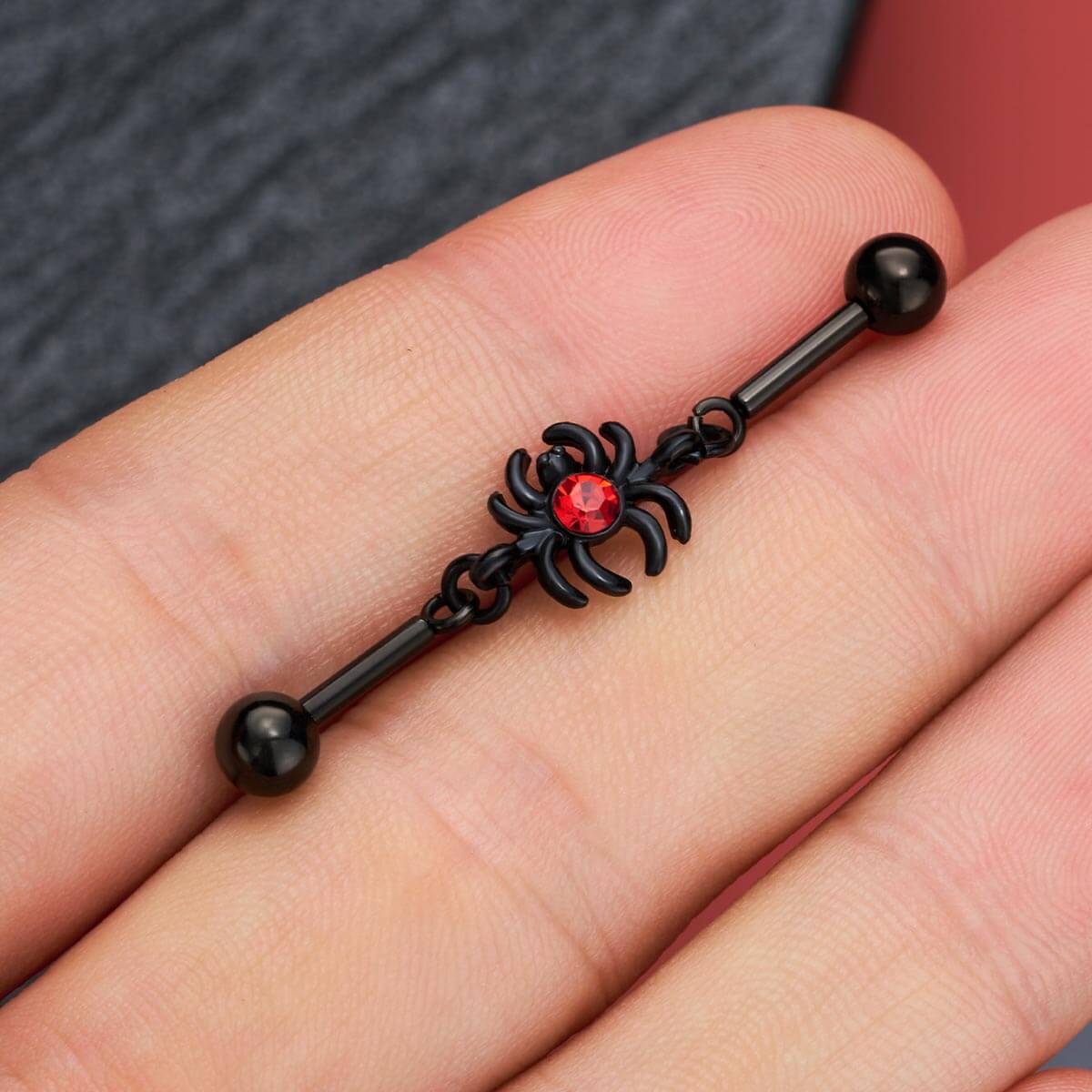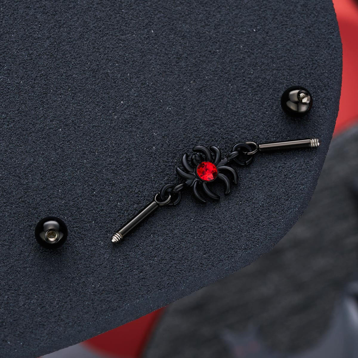 This is a bold and eye-catching piece of Halloween industrial bar that combines gothic intrigue with vibrant flair. This industrial barbell features a striking spider charm adorned with a vivid red cubic zirconia, adding a pop of color and a touch of spooky sophistication. The intricate detailing of the spider, paired with the sleek barbell design, creates a dramatic and unique accessory that stands out from the ordinary.