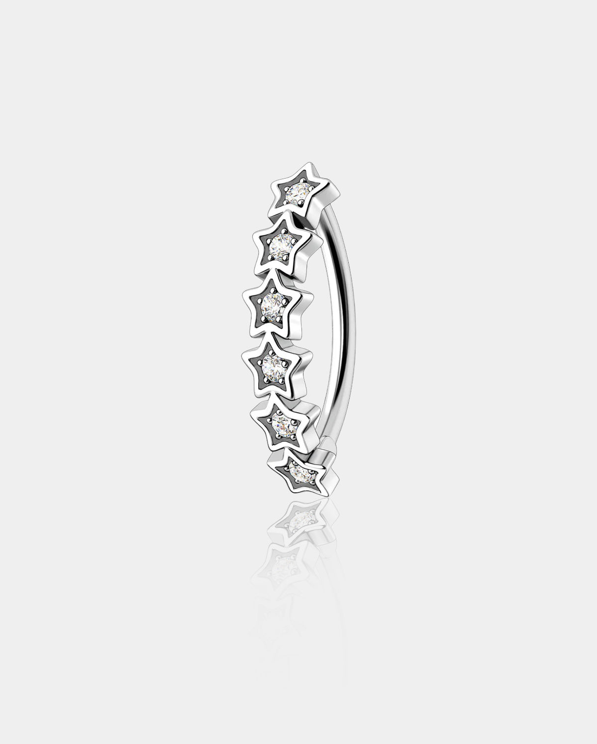 This is a mesmerizing adornment that transforms your navel into a celestial masterpiece. Crafted with precision and elegance, this star climber belly button ring is more than just jewelry; it's a statement of individuality and cosmic beauty. At its core lies the sturdy yet sleek 14-gauge curved barbell, ensuring both comfort and durability as it gracefully hugs your belly button. But it's the stars that truly steal the show. Imagine a constellation of delicate star-shaped embellishments, meticulously arranged in a vertical sequence along the curve of the barbell. Each star twinkles with its own brilliance, reflecting light and drawing the eye with an irresistible allure. Whether you're gazing upon it in awe or catching glimpses of its shimmering presence in the mirror, this belly button ring is sure to evoke a sense of wonder and enchantment.