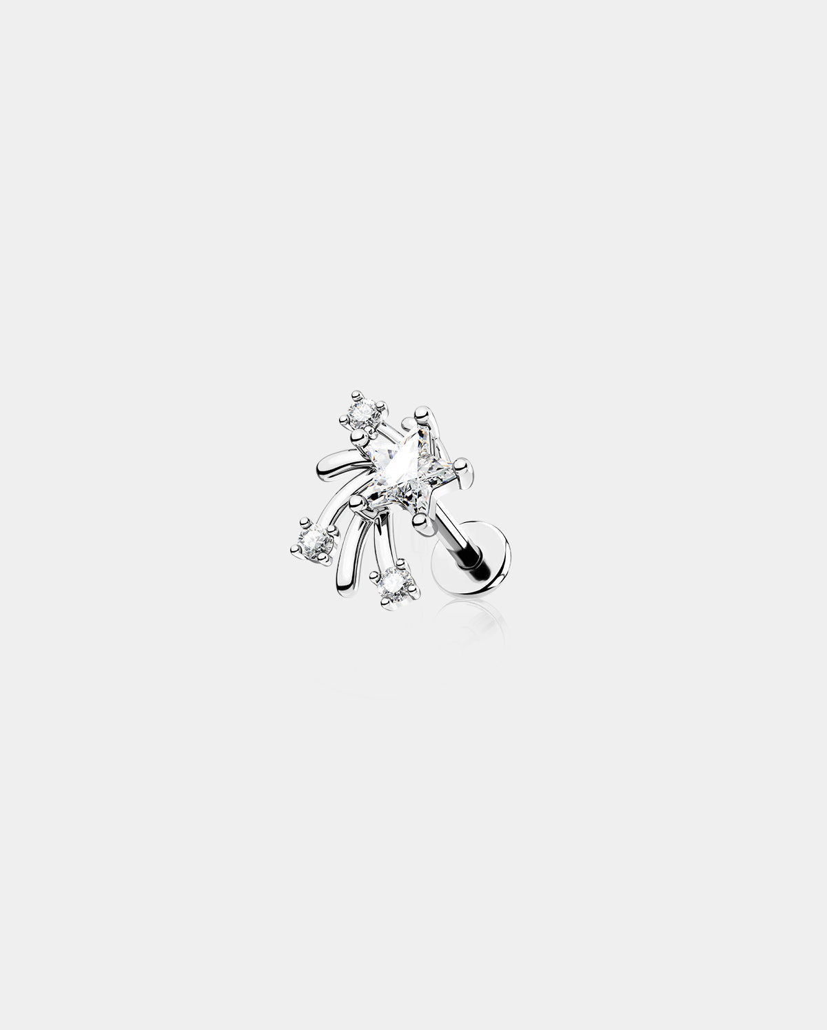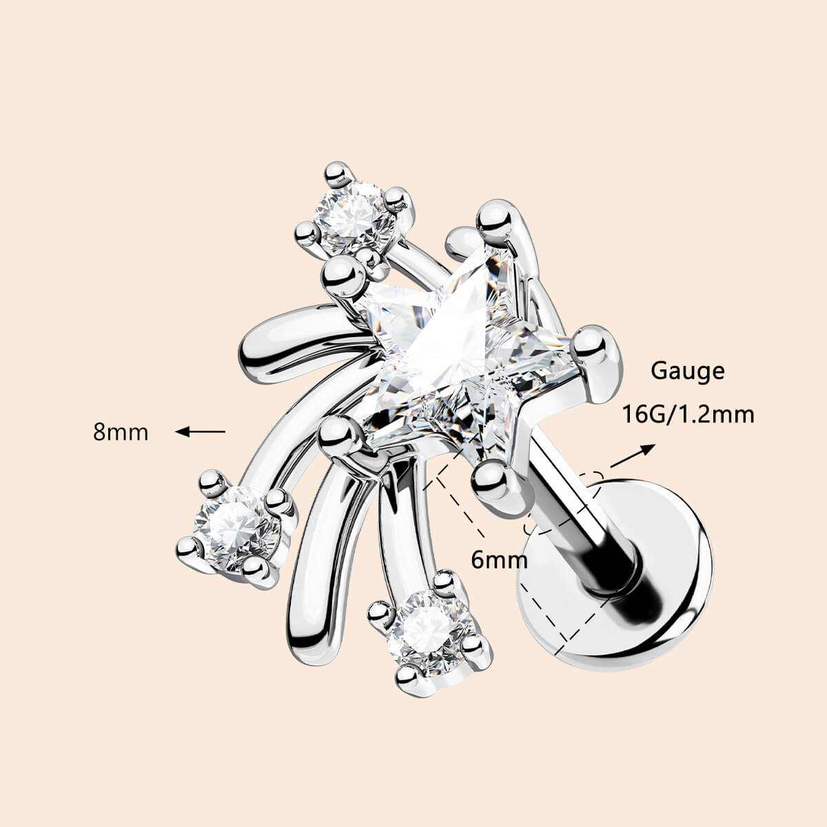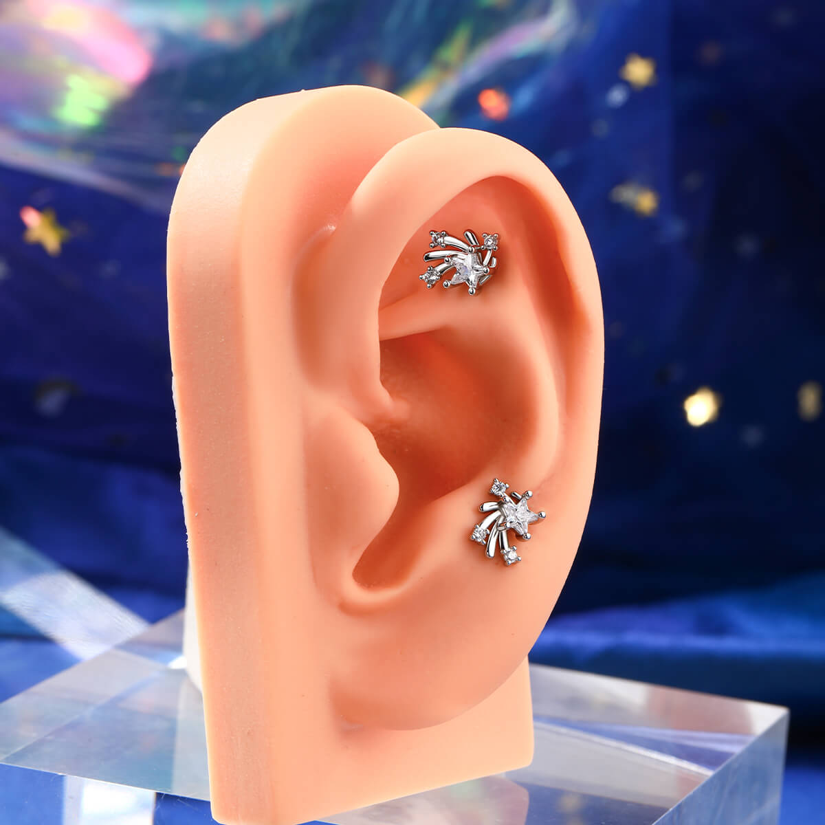 The helix stud features star-shaped top, crafted with clear cubic zirconias, sparkles brilliantly, mimicking the twinkling of stars in the night sky. As you move, the light beams dance and play, adding a dynamic and eye-catching element to the stud. Perfect for helix, tragus, or conch piercings.