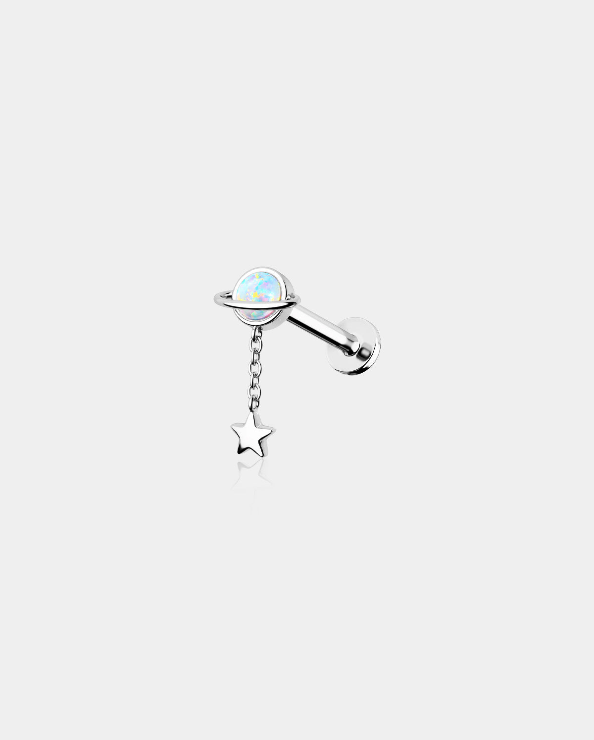 Featuring a miniature planet and a dangling star, the 16G Internally Threaded Star Dangle Planet Labret Cartilage Stud adds a whimsical celestial touch to your piercing. Crafted with precision, this unique design offers a playful, cosmic vibe. The internally threaded design ensures a secure and comfortable fit, making it perfect for both lip and cartilage piercings.