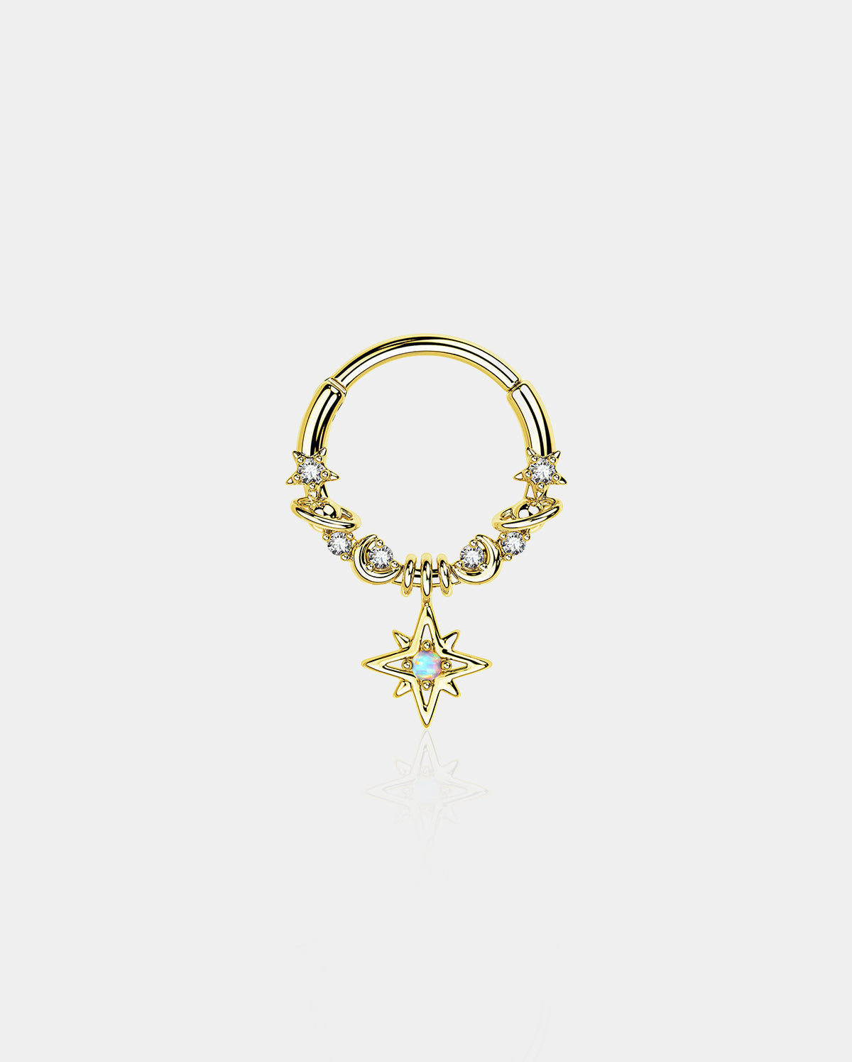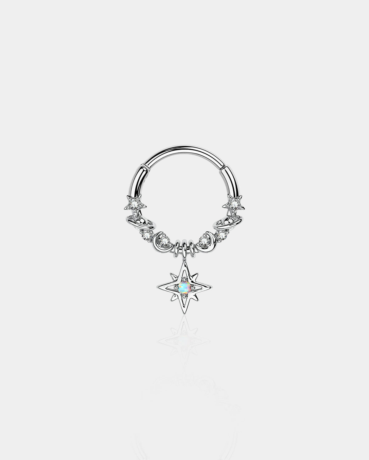 Have you tried dangle septum ringsbefore? They are so pretty! Regarding this piece, we design the basics of outer space elements, you can find stars, the moon, and planets on this hinged segment ring.