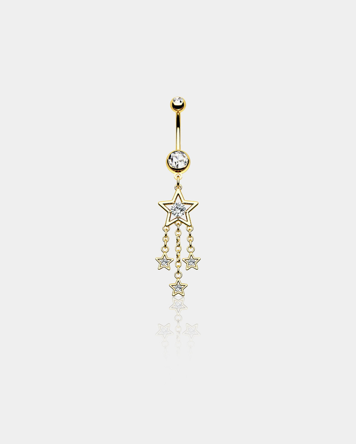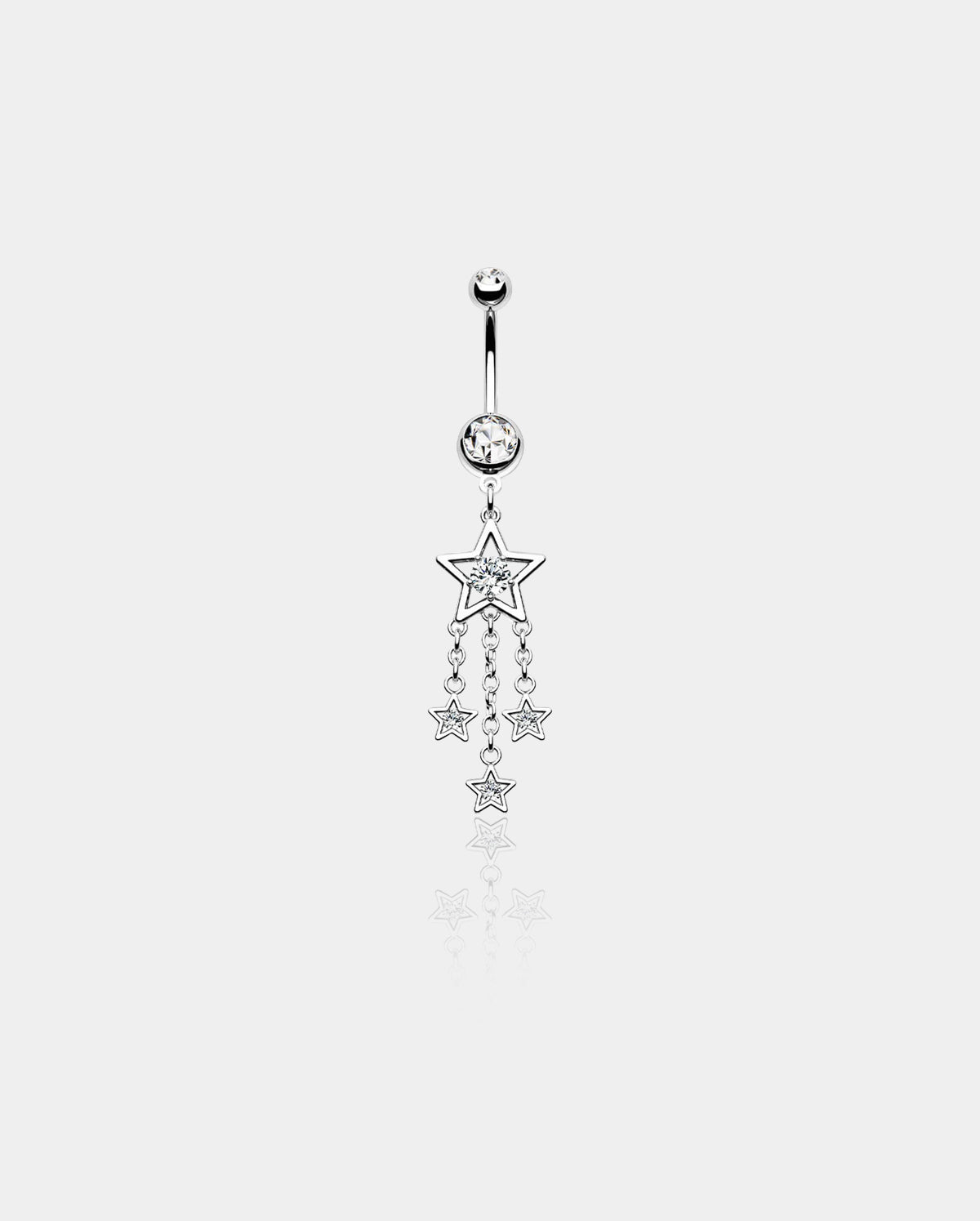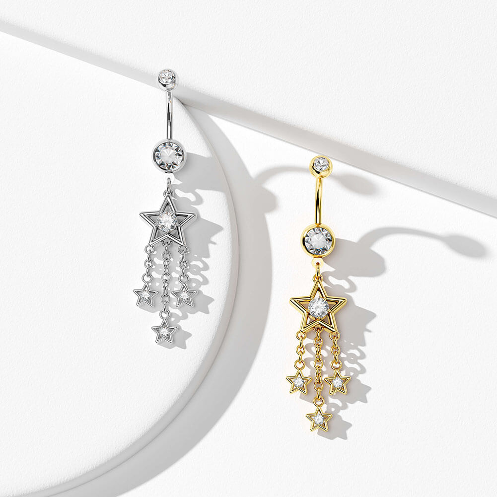 Experience this luxurious belly button piercing dangle ring featuring three stars with radiant CZ gems, held together by a 14 gauge stainless steel post. Meticulously crafted with high-grade 316L stainless steel, this piece offers superior safety, durability, and shine.