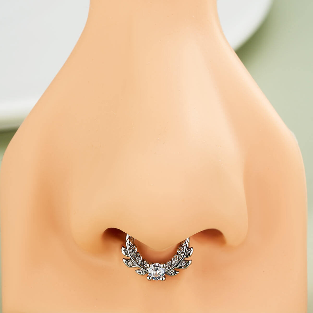 This leave septum ring combines elegance and sophistication. Its intricate leaf design is adorned with sparkling clear cubic zirconia (CZ) stones. Perfect for septum or daith piercings, it adds a refined touch to everyday outfits and special occasions, making it a versatile and timeless accessory.