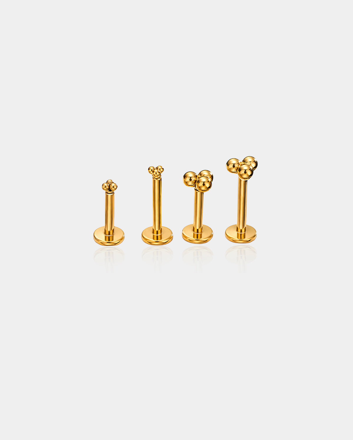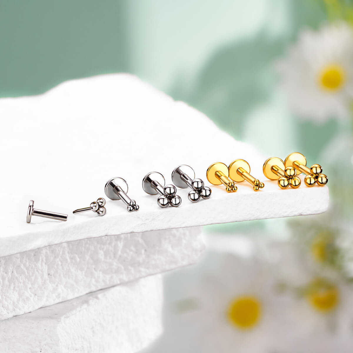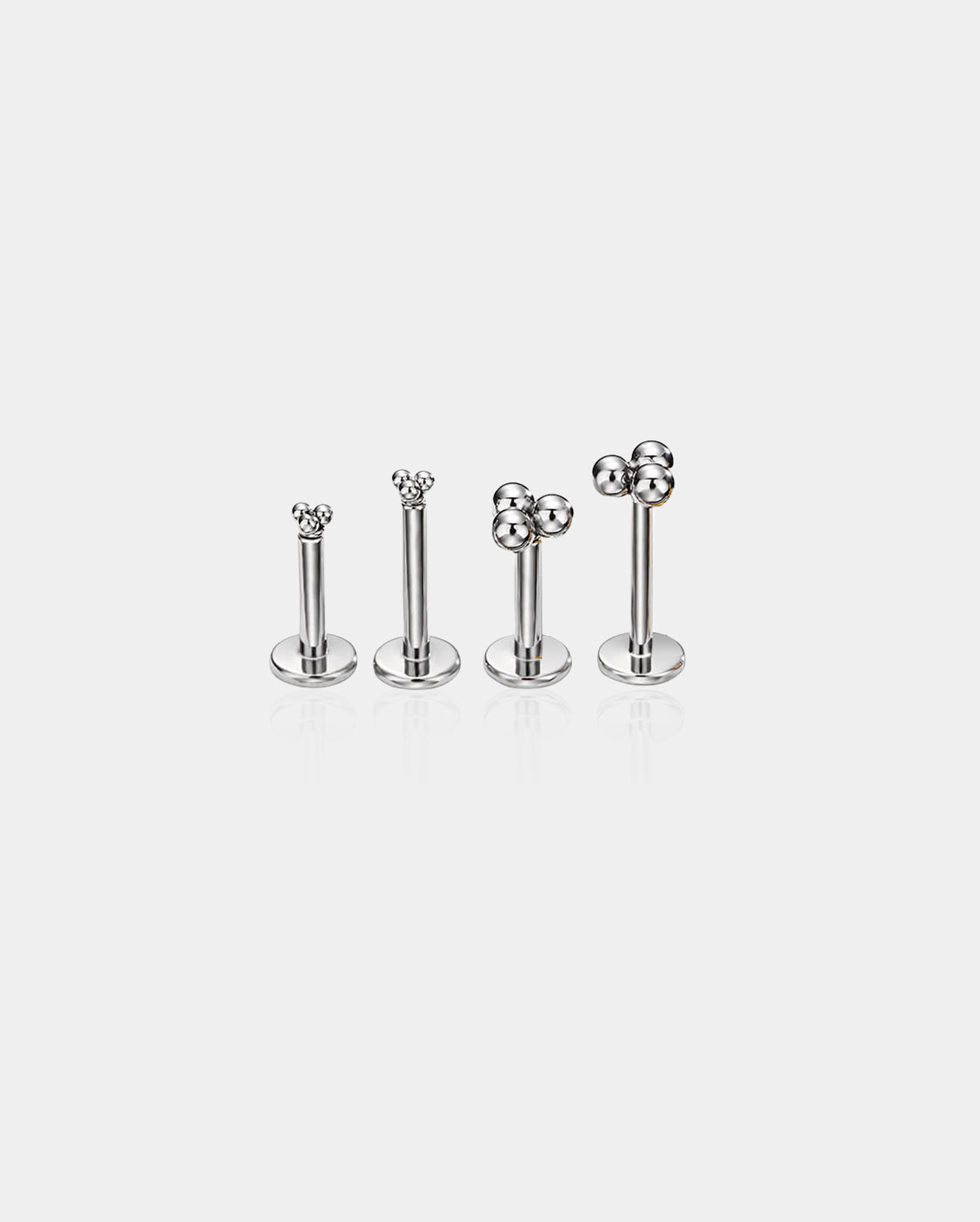 This beads labret stud is a unique and fashionable body jewelry piece. It ensures exceptional durability and hypoallergenic properties, ideal for those with sensitive skin. The design features three small beads arranged in a triangular pattern at the top, offering a modern and minimalist aesthetic. Available in various sizes, this labret stud ensures a comfortable and secure fit for different piercings. The threadless or push pin mechanism allows for easy and quick insertion and removal, while the flat back provides added comfort against the skin, making it suitable for prolonged wear.