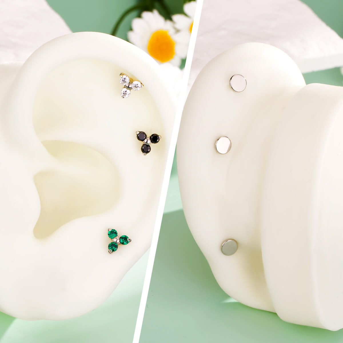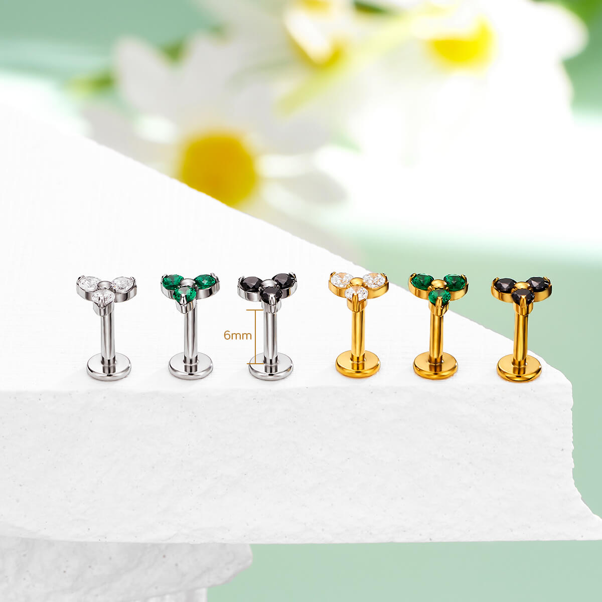 This is a sophisticated and stylish accessory designed for cartilage piercings. This earring features a secure and convenient threadless push-pin mechanism for easy insertion and a comfortable flat back to minimize irritation. The design is adorned with three tiny cubic zirconia (CZ) stones arranged in a delicate, sparkling trio, adding a touch of elegance and shine. Its minimalist yet eye-catching design makes it perfect for both everyday wear and special occasions, offering a refined and contemporary look to enhance any piercing collection.