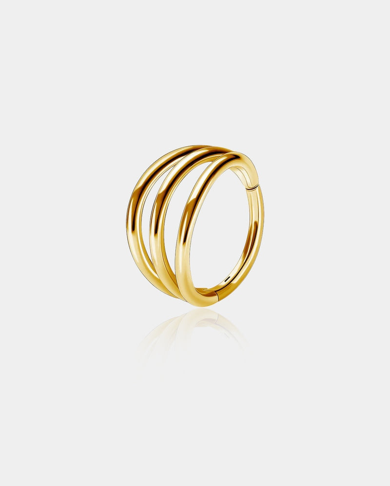 This simple and gorgeous multi-piercings cheater conch jewelry features three layered high polished rings but uses the same hinged segment, which means one hoop provides three piercings look. It's perfect for multi piercings including helix, conch, tragus, and so on.