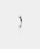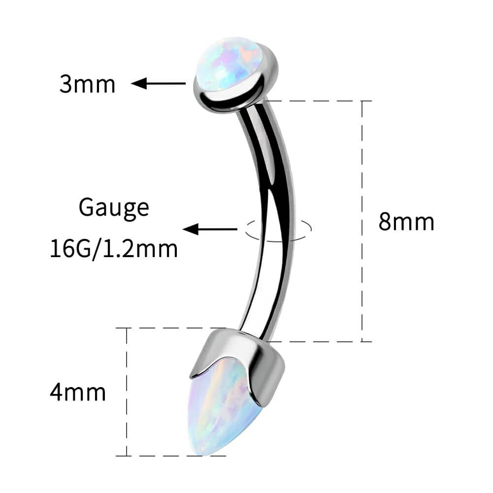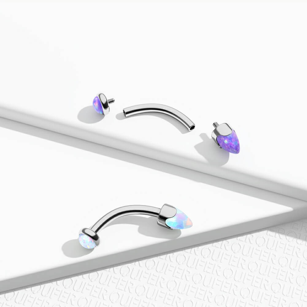 This titanium curved opal rook earring is a luxurious accessory featuring stunning opal gems on both sides. Internally threaded for improved wear, durability, and safety, it's a sophisticated and elegant piece of jewelry perfect for daily life.