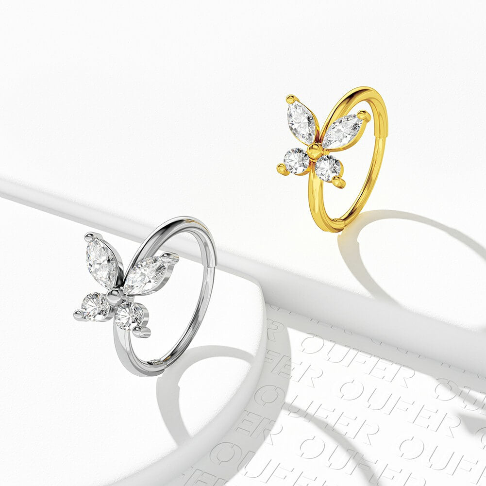 This butterfly nose piercing ring is a must-have in your collection! Is there anyone who doesn't love butterfly jewelry? The shape of the butterfly is a classic style that is suitable for any occasion. There are shiny CZ mosaicked in the butterfly, it reflects the light beautifully!