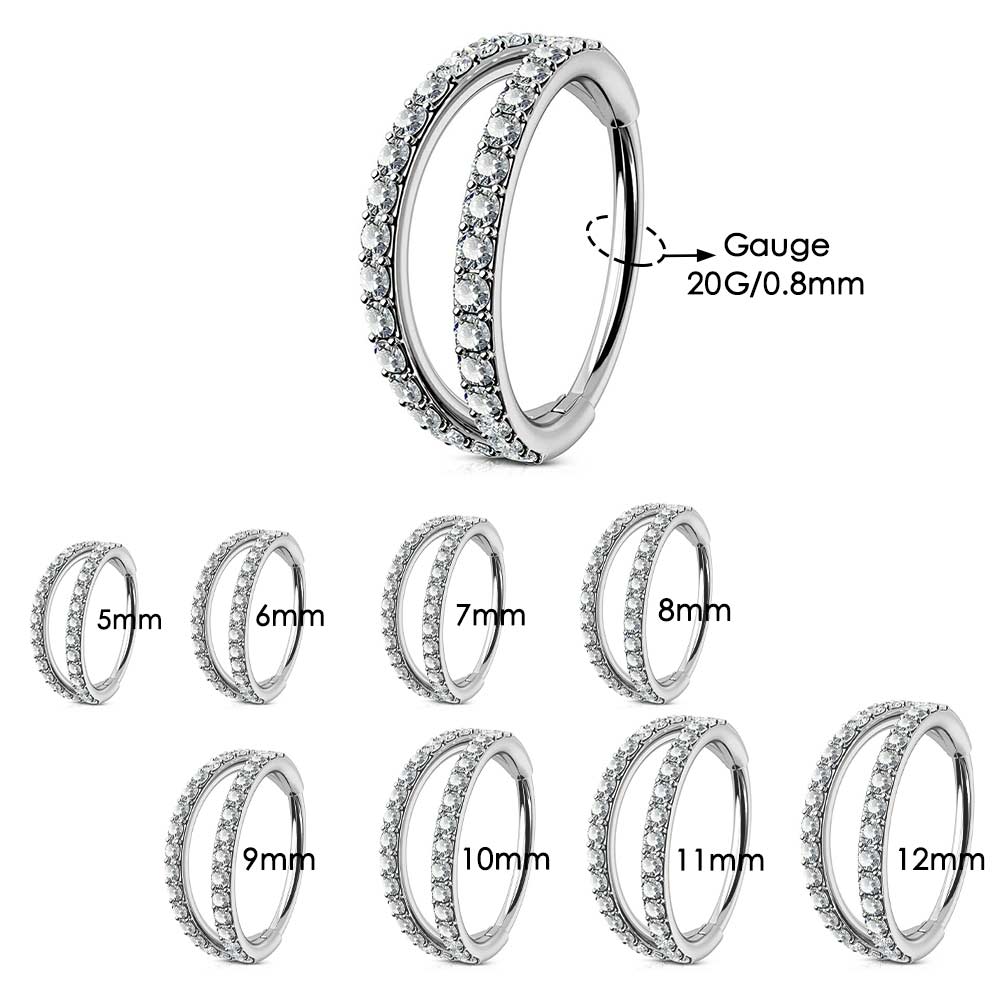 Made of Titanium 6Al-4V-Eli ASTM F-136 material. Hinged segment hoop. Bar Thickness: 20G=0.8mm, Inner diameter: 6mm, 7mm, 8mm, 9mm, 10mm. It can be worn on most cartilage piercings and nose rings, conch, daith, helix, lobe, rook, snug, tragus, and nostril.