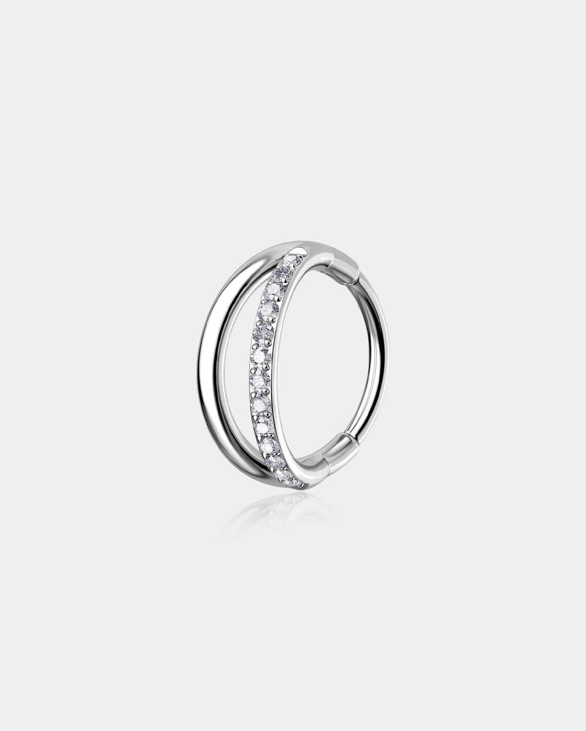This is a chic and modern piece of nose ring that adds a touch of sparkle to your look. Crafted from ASTM F-136 titanium, this nose ring features two interconnected hoops, with one adorned with a row of dazzling cubic zirconia stones. The half-circle design creates a bold yet elegant aesthetic, while the high-quality CZ stones provide a subtle but eye-catching shine. Hypoallergenic and perfect for sensitive skin, this nose ring combines both style and comfort.