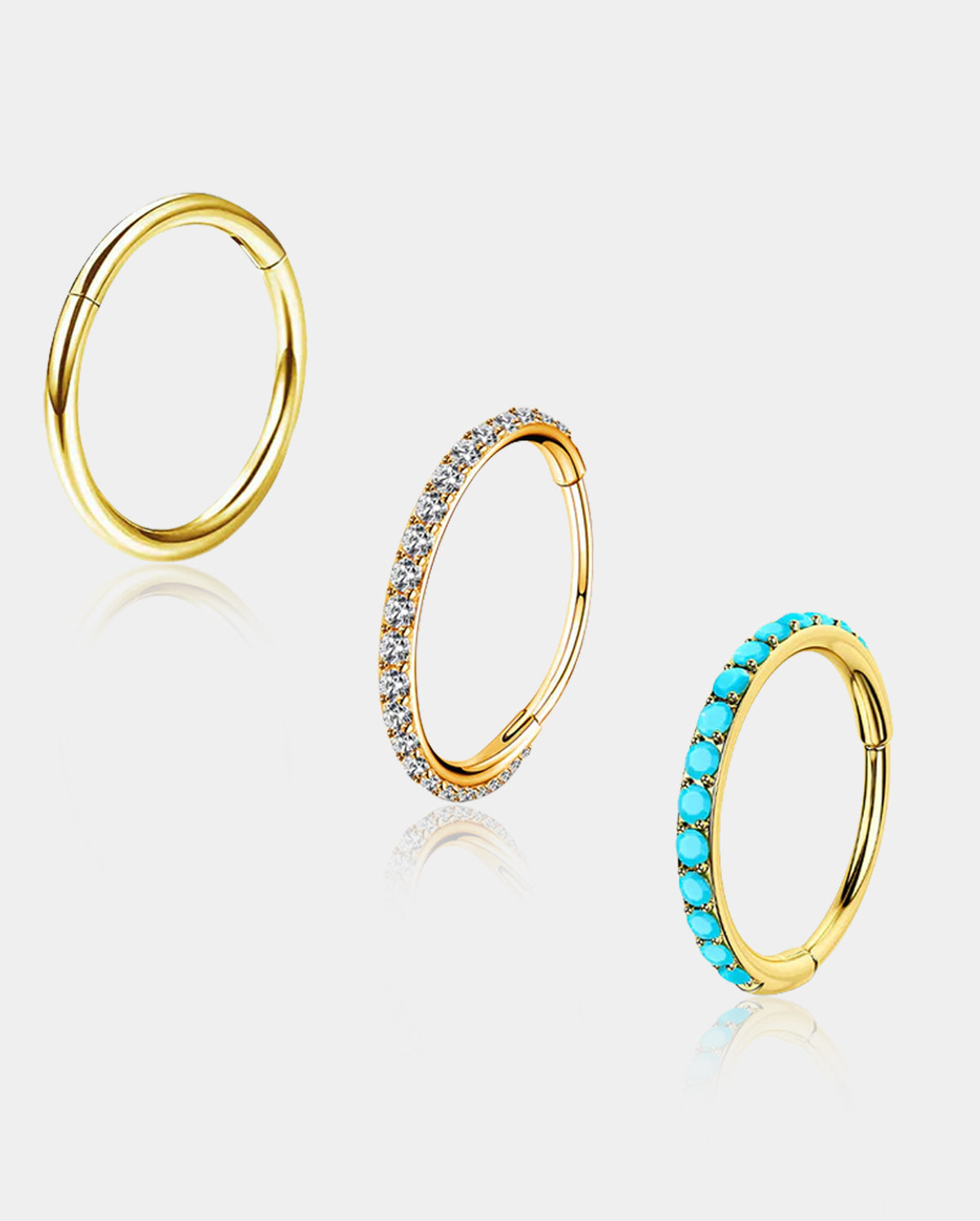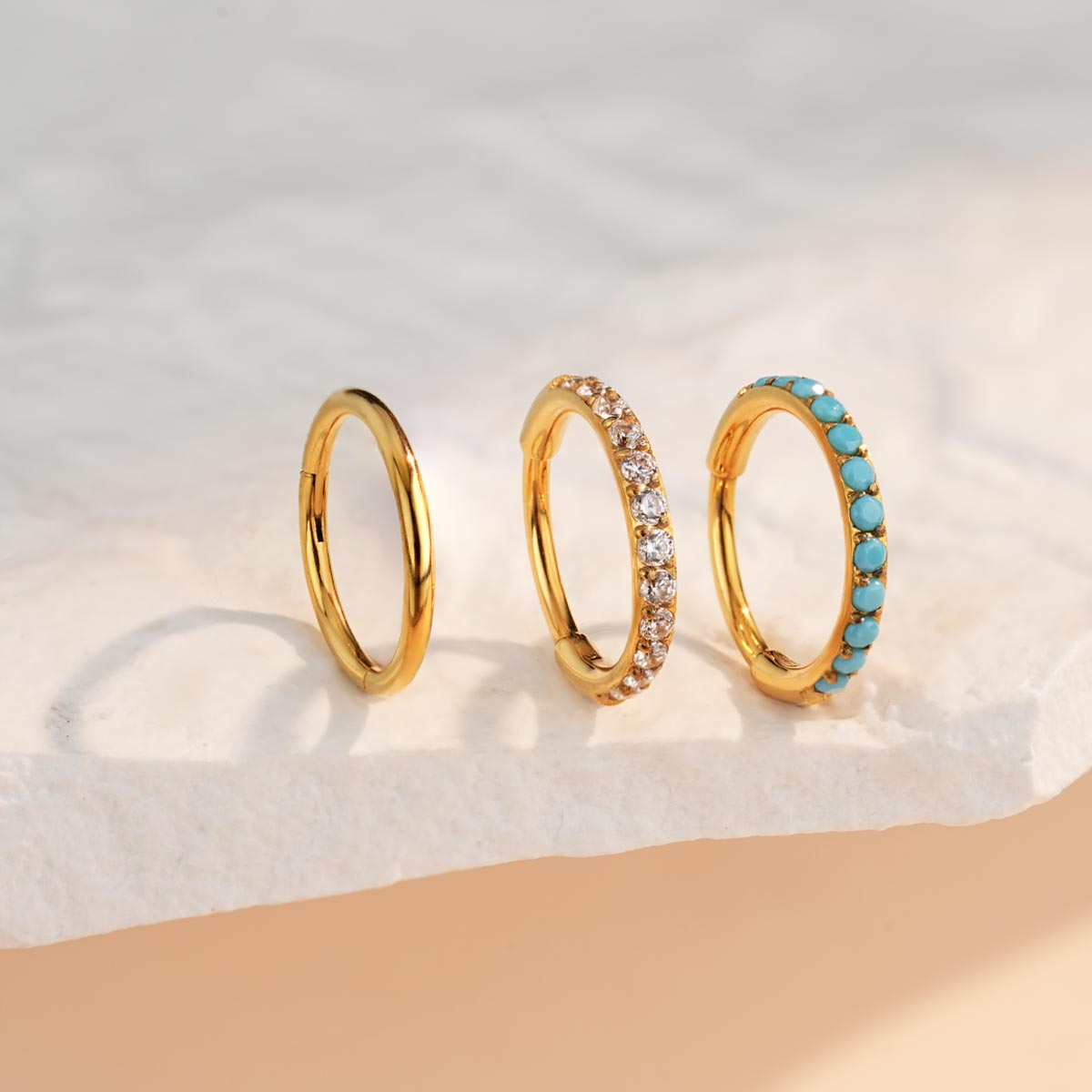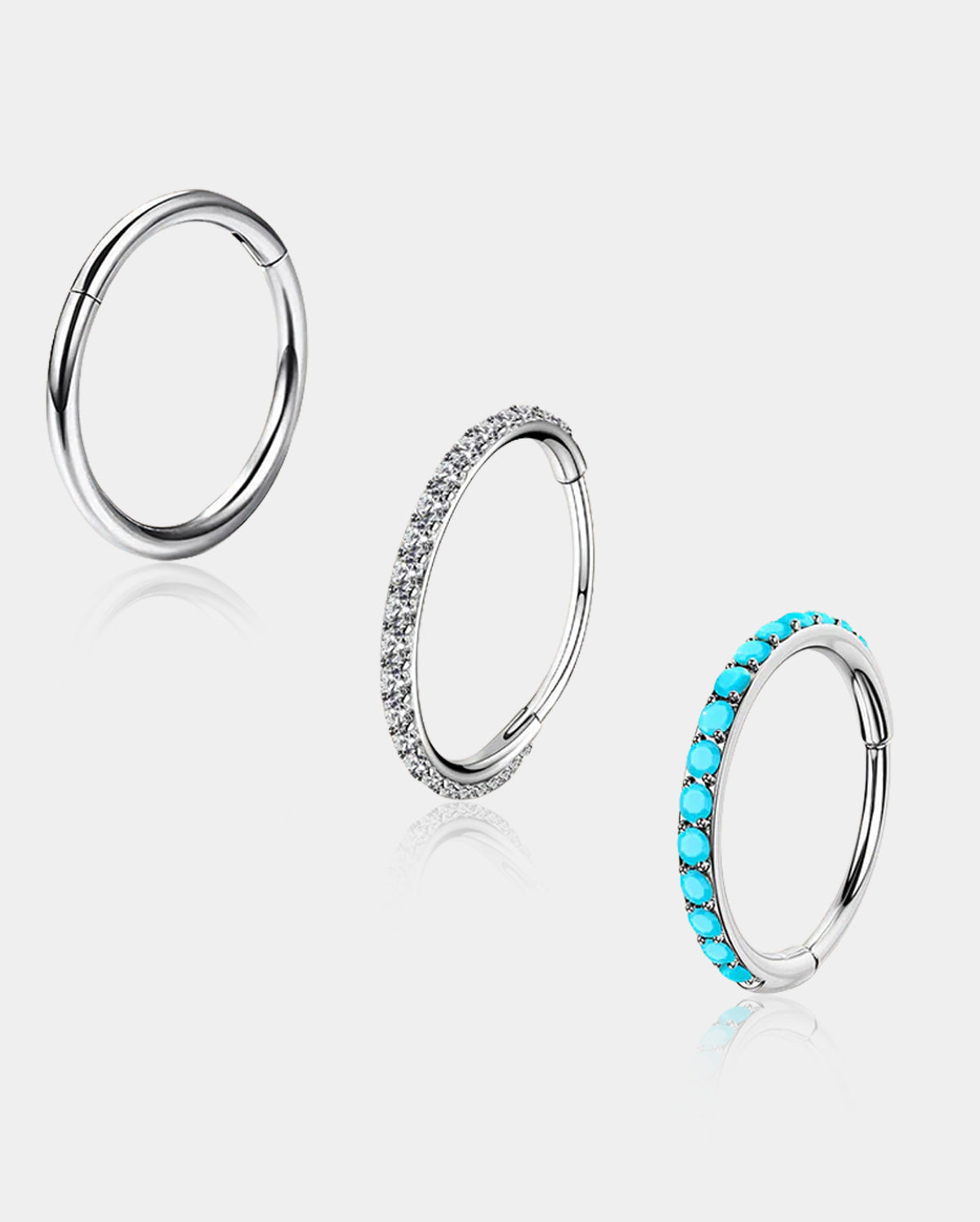 This nose rings set featuring a trio of sleek, versatile designs crafted for subtle sophistication. Each hoop showcases a distinct aesthetic: a vibrant turquoise stone adds a pop of color and bohemian charm, a sparkling CZ (cubic zirconia) offers understated glamour with its delicate sparkle, and a polished sleek design delivers modern minimalism at its finest. These lightweight hoops are comfortable for daily wear, whether you’re dressing up or down.