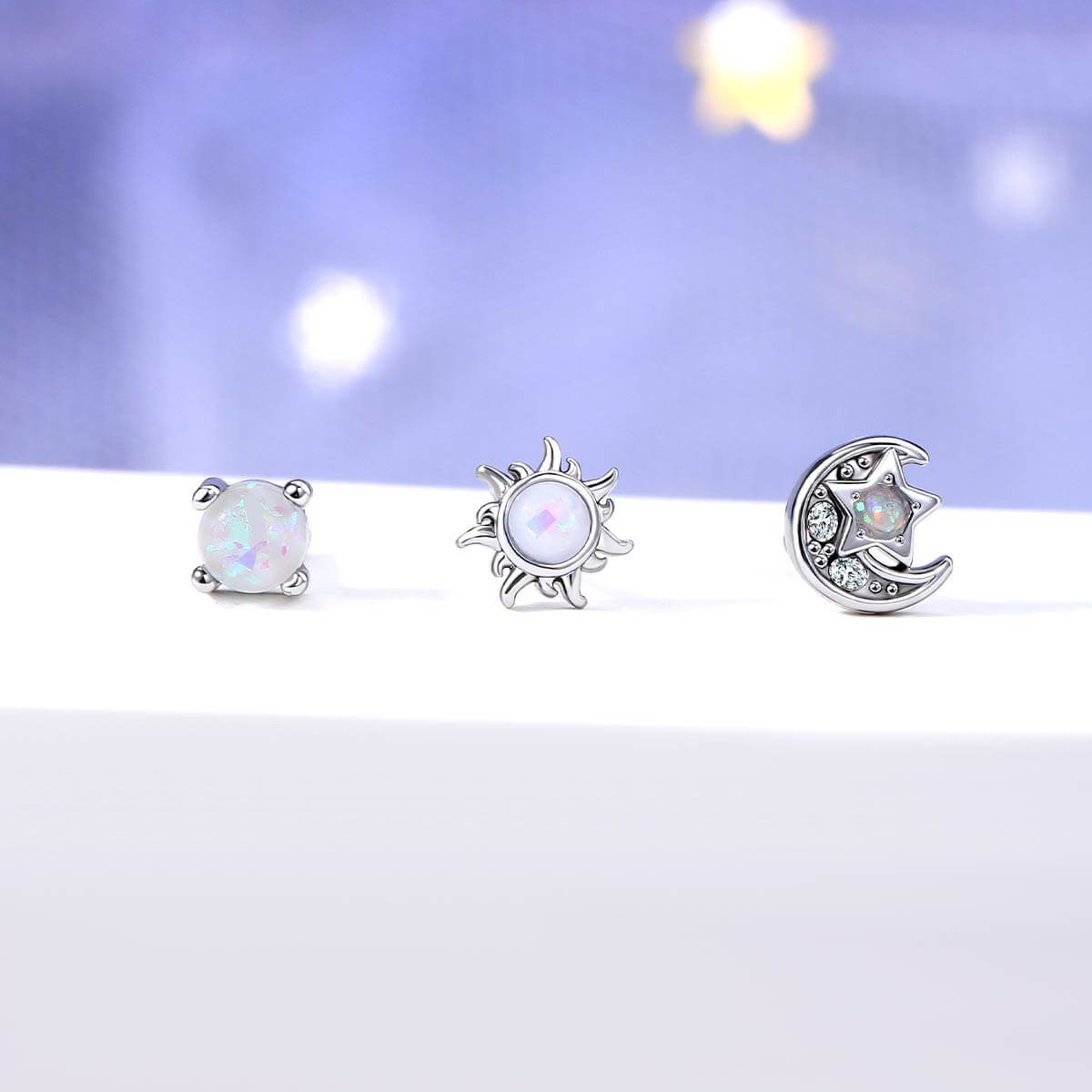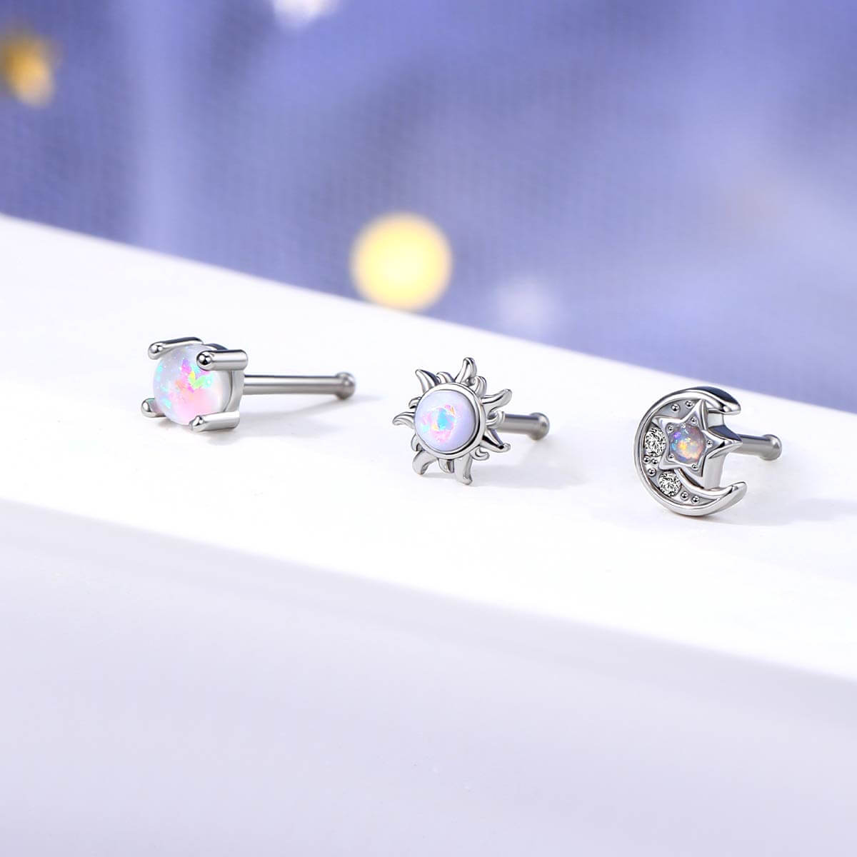 How fun and adorable is this set of opal nose studs? It includes 3 playful designs: a crescent moon, a shining round opal, or a delicate sunflower.