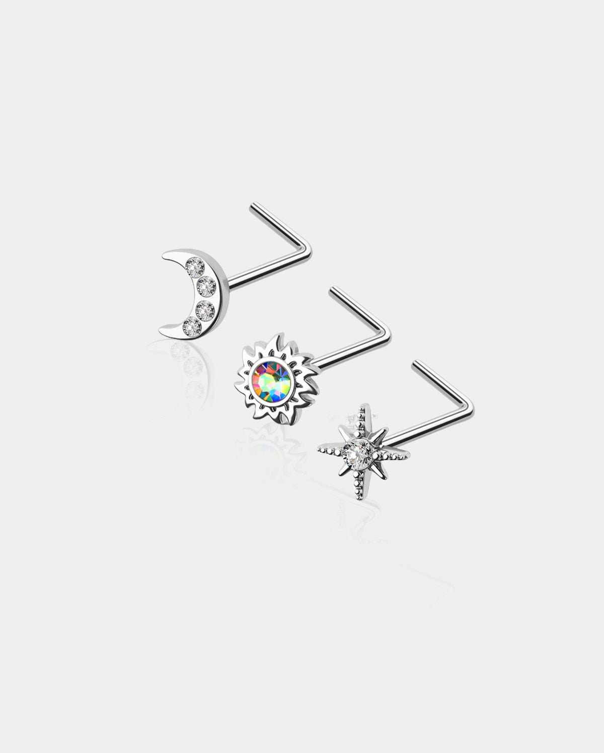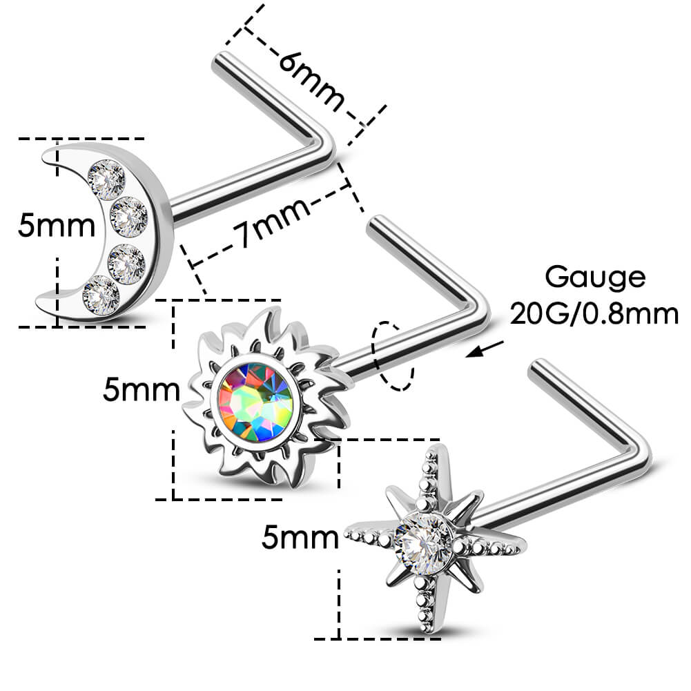 The L-shaped nose stud set includes three distinct stud designs, with one featuring a sun, another a moon, and the third a star. These celestial-themed studs add a unique and charming touch to your nose jewelry collection.