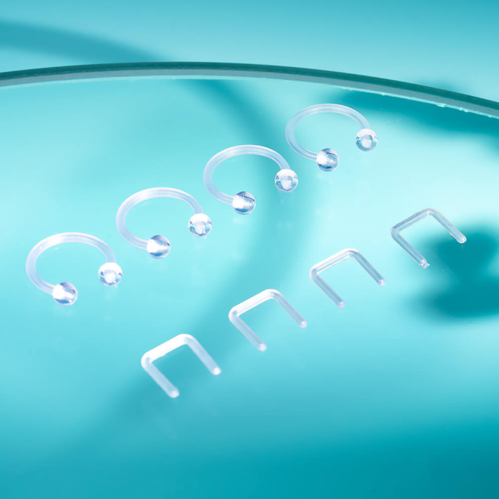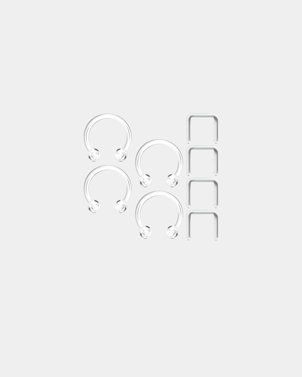 Acrylic is such a good material for people who are allergic to stainless, titanium, and even 14K gold. This septum clear retainer pack includes 4 pcs of horseshoe style and 4 pcs of U-shape style, no fade, no deform, also perfect for school/work occasions.