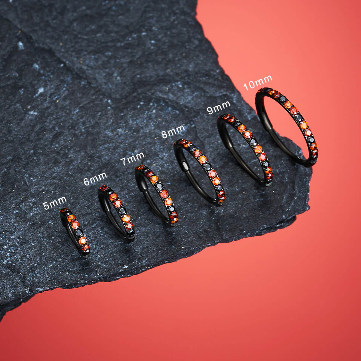 This Halloween nose ring is a vibrant and festive piece designed to celebrate the spooky season with a splash of color. Featuring a range of eye-catching hues, the orange, black, and red embrace the Halloween spirit with the simple and beloved hinged nose ring style.