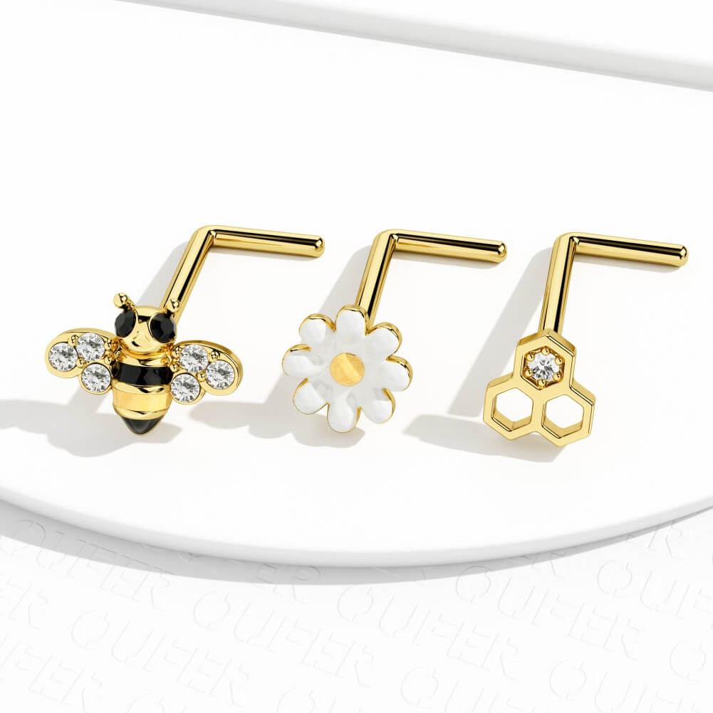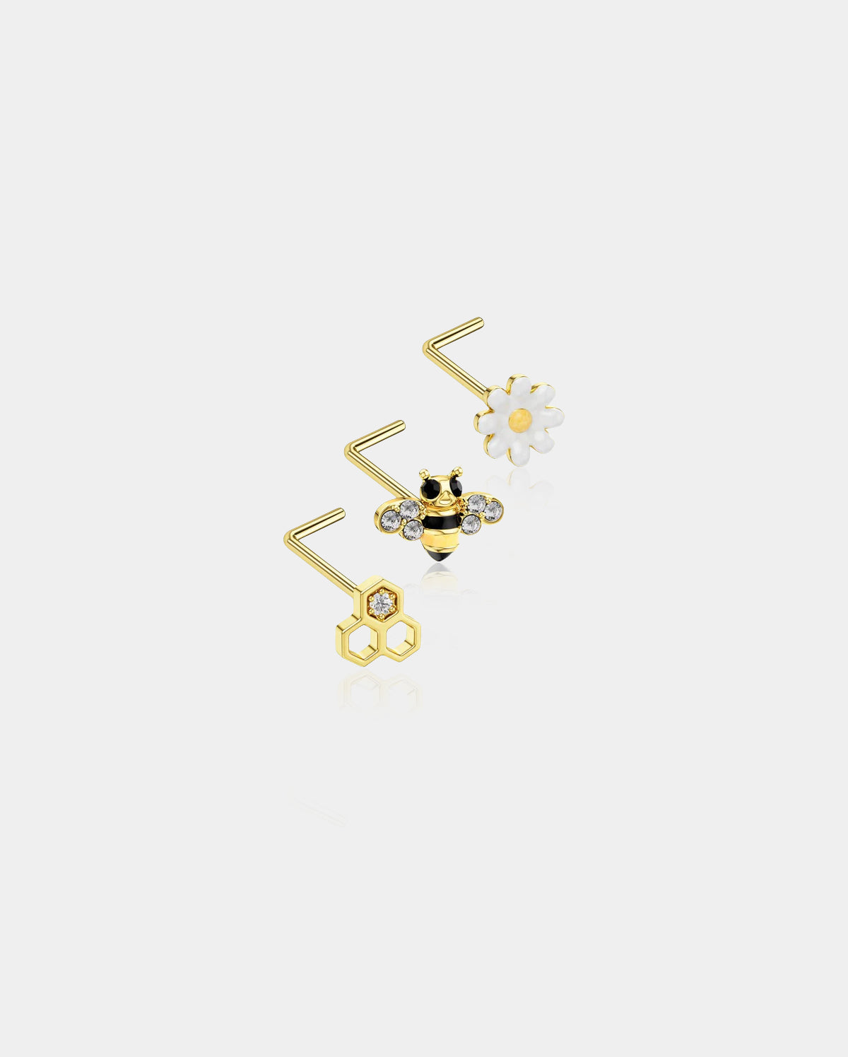 The beauty of the natural world and its magic food chain is a source of inspiration for this triple-set nose stud product. 18K yellow gold plated with cubic zirconia diamonds and epoxy honey/daisy flower/bee mirror the food chain found in the natural world. We always appreciate the present from the natural world.