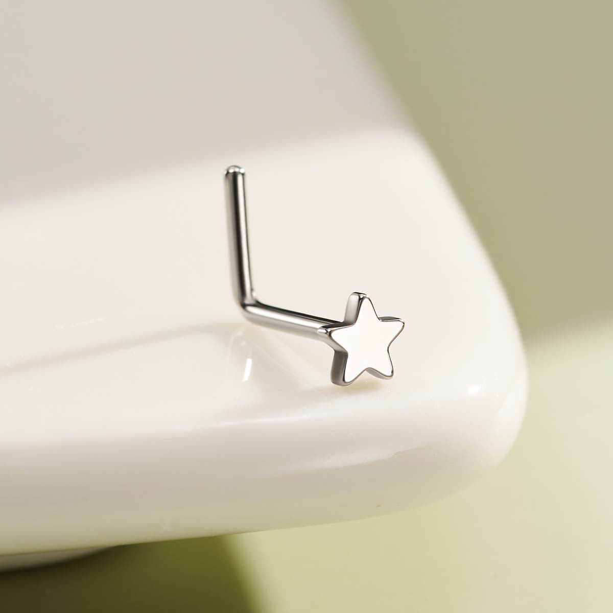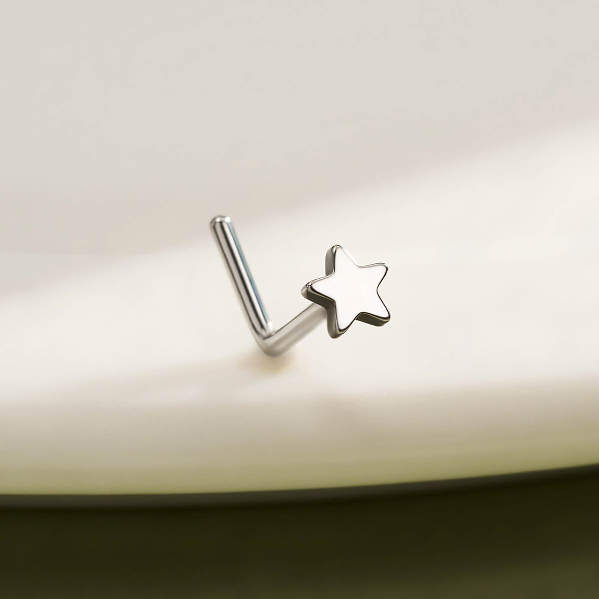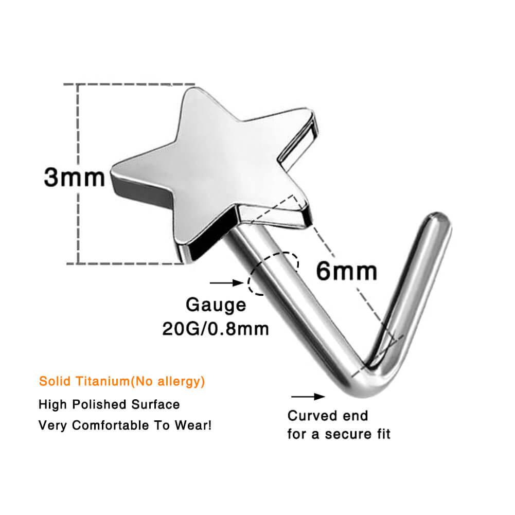 This titanium star nose ring stud is decorated with an adorable and shinny flat crescent star end, and also features an L-shaped wearable barbell, easy to wear and get a timeless style.