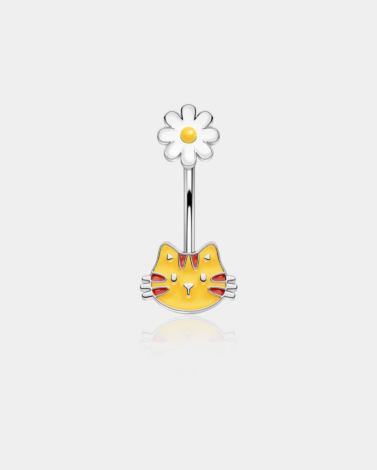 This eye-catching cat belly button ring features two adorable charms—a delicate daisy and a quirky cat face. The belly ring is vivid and lovely for wearing, especially for girls.