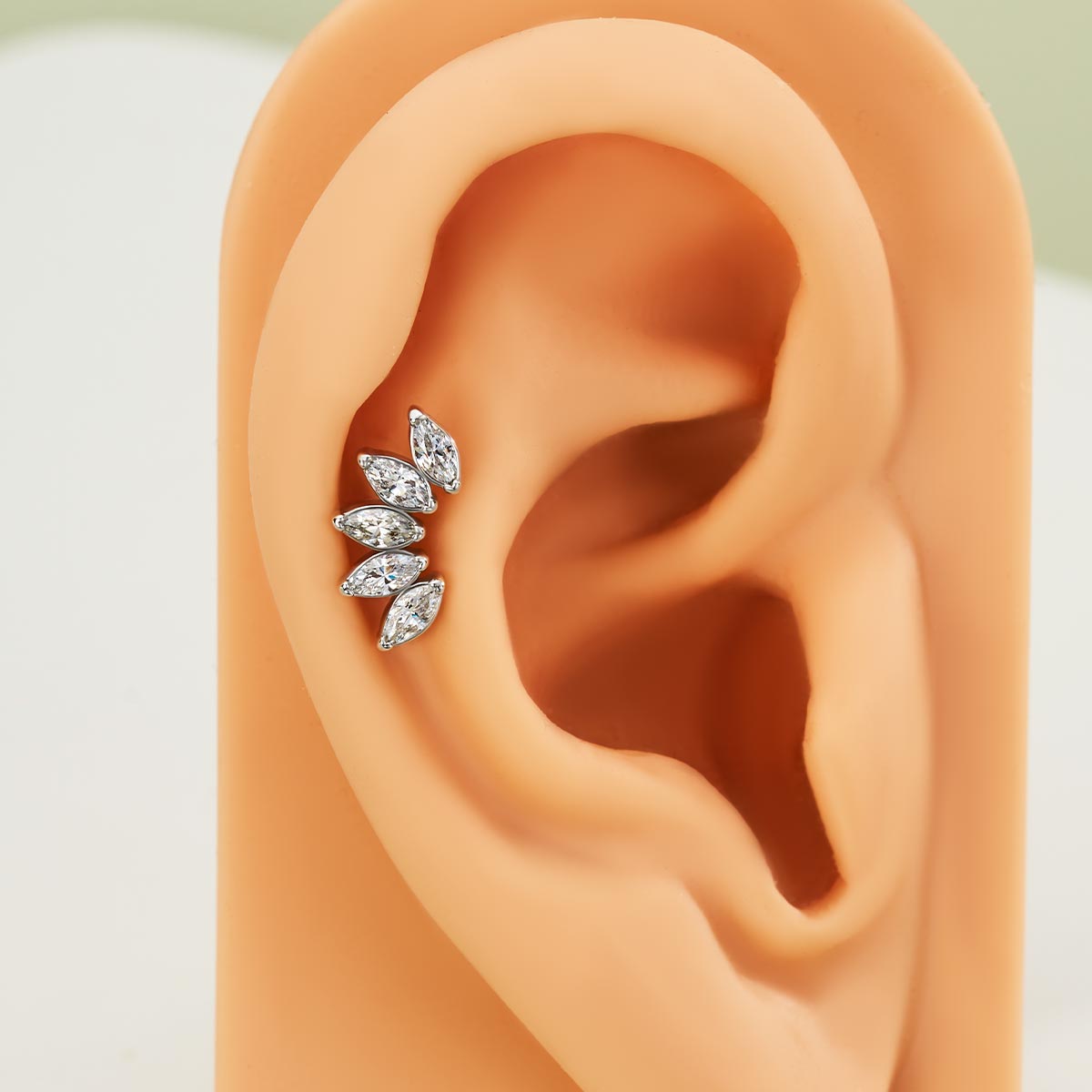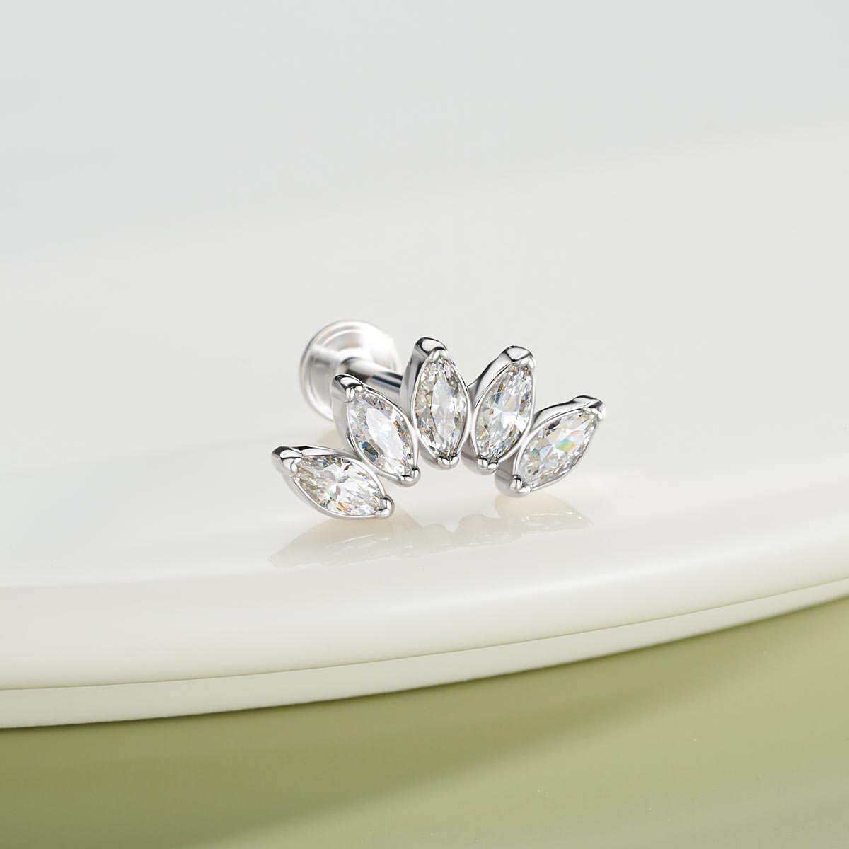 The crown helix labret stud is adorned with five marquise-cut cubic zirconia (CZ) stones, arranged in a dazzling pattern that mimics the elegant lines of a crown motif. The marquise-cut stones offer a refined sparkle and a touch of luxury, making this earring an ideal choice for those looking to add a unique and glamorous element to their cartilage piercing